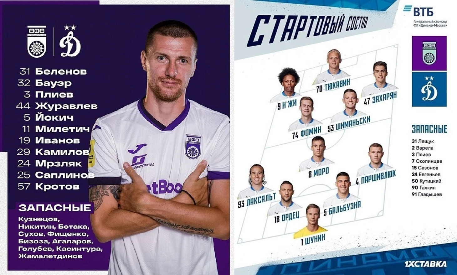 Состав. Неделю назад Динамо начало сезон не самой уверенной победой в Ростове, а во втором туре нас ждал соперник посильнее, и к тому же снова в гостях. Динамо отправилось в Уфу, где в футбол играют на искусственном газоне. Перед началом матча стало известно, что скорее всего из-за повреждения не сыграет Лесовой, а когда же объявили стартовые составы, то оказалось, что Игбун также вне заявки из-за травмы, полученной на предигровой тренировке. Лично я ожидал появления Скопинцева на левом краю вместо Лесового, но всё оказалось гораздо проще — в старте появился Нжи. Все остальные позиции остались без изменения, хотя клубный Инстаграм поменял местами Фомина и Шиманьски, что означает ровным счётом ничего, так как каждый из этой пары способен заменить друг друга. У нашего же соперника вообще не было никаких изменений в составе. Таким образом, оба тренера были довольны своими командами и их игрой в предыдущем туре.
