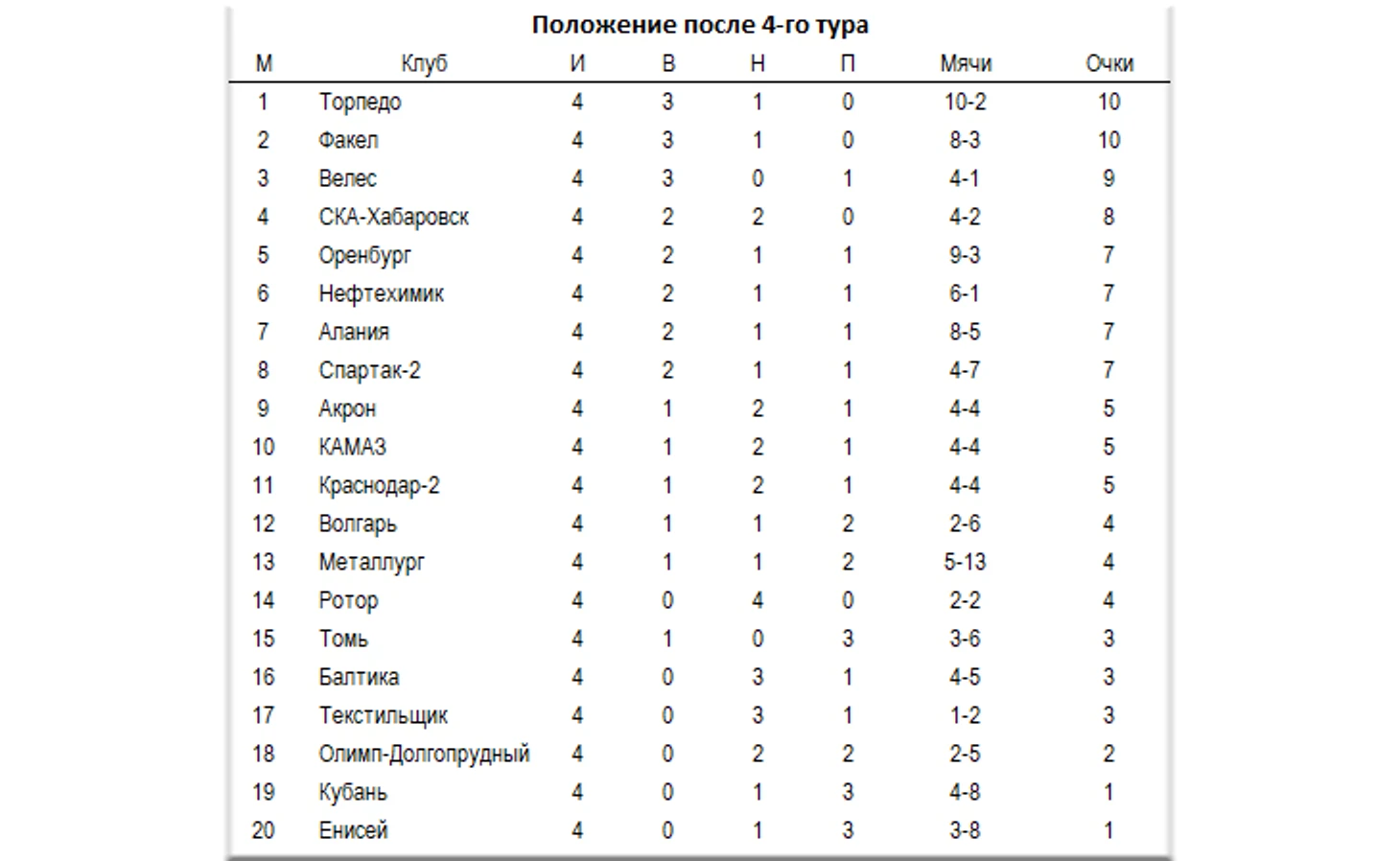 Воронежцы после четырех туров делят лидерство с московским «Торпедо». При этом они успели встретиться с двумя претендентами на повышение в классе – «Балтикой» (3:3, дома) и «Оренбургом» (2:1 в гостях). Старт «Акрона» получился вполне приемлемым для середняка – 5 очков в 4-х турах.