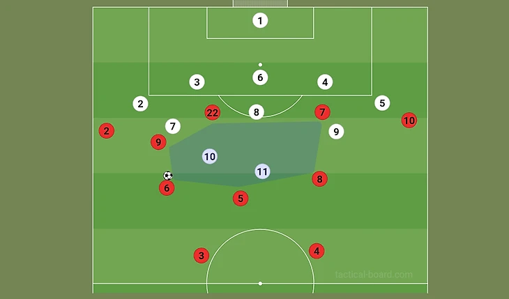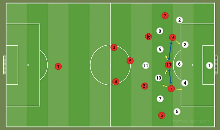 1. Ротация нападающих по всей ширине поля. Подобное использовалось в начале сезона 2020/21. Смысл трюка – застать врасплох персональных опекунов соперника;