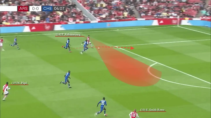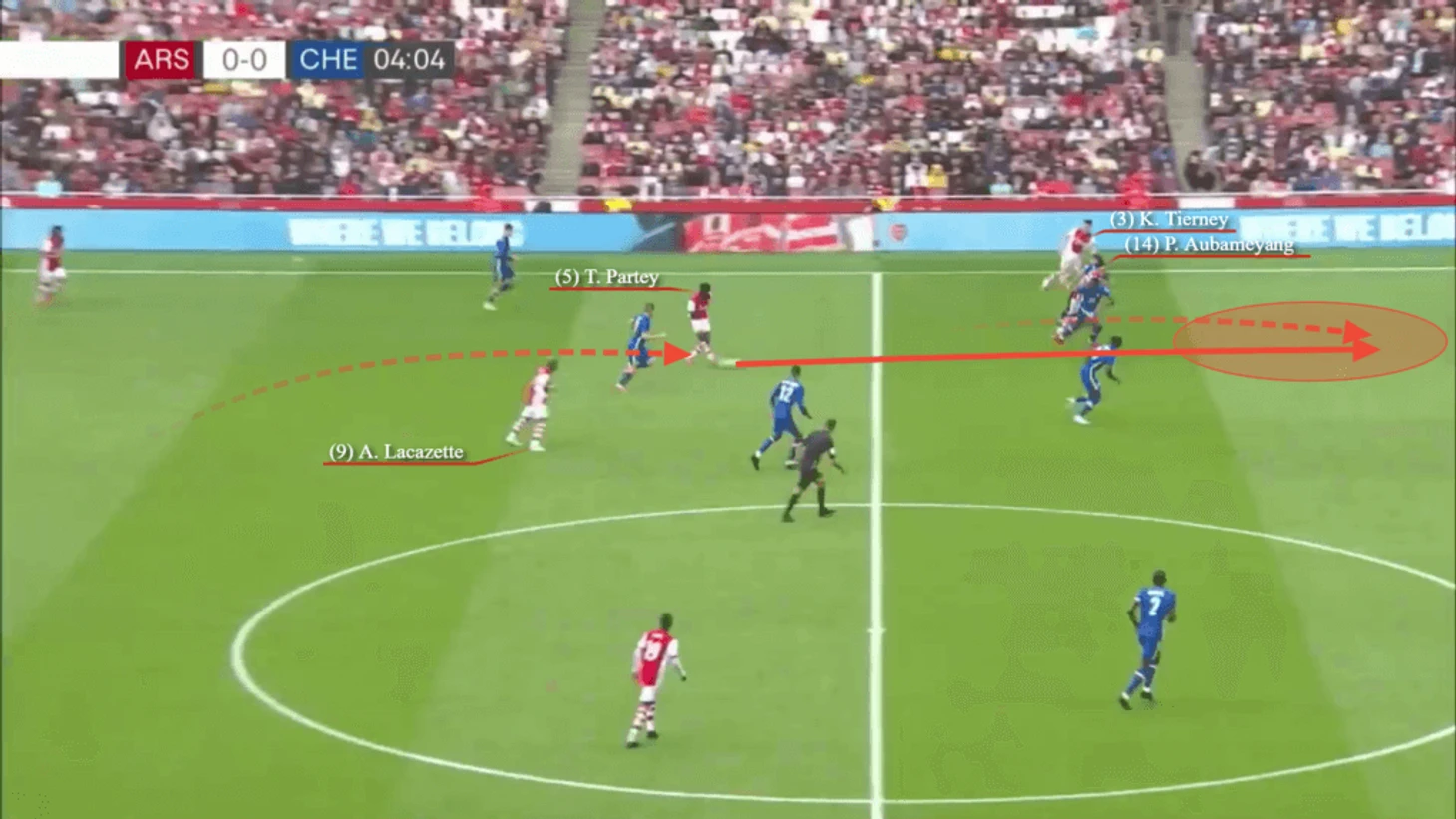 Томас тащит футбольный снаряд из глубины, а Ляказетт остается за линией мяча. По принятии мяча Обмаеянг глазами ищет отсутствующего нападающего, и ему приходится ждать, пока Смит Роу добежит в эту позицию из середины поля.