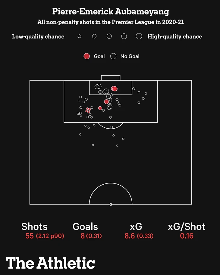 Это один из 8 его голов головой за последние два сезона. У Ляказетта всего 5 из его 50 с сезона 2017-2018, а у Обамеянга 4 примерно за тот же период.