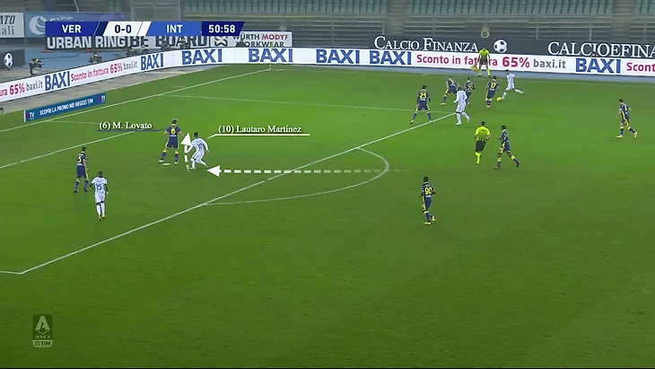 Мяч еще не покинул ноги товарища по команде, а Лаутаро уже начал выскакивать из-за спины игрока обороны "Вероны".