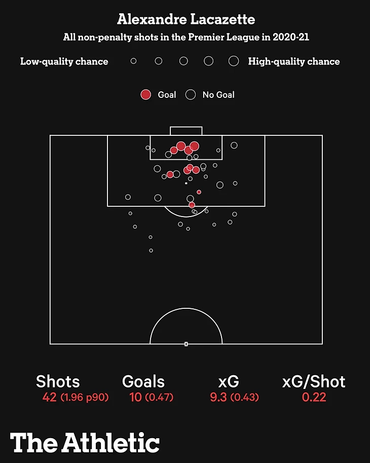 А вот Ляказетт больше бил из вратарской площадки, что является вероятным следствием кроссов Кирана Тирни.