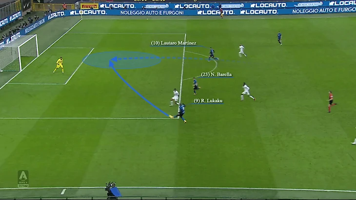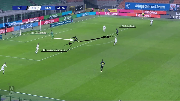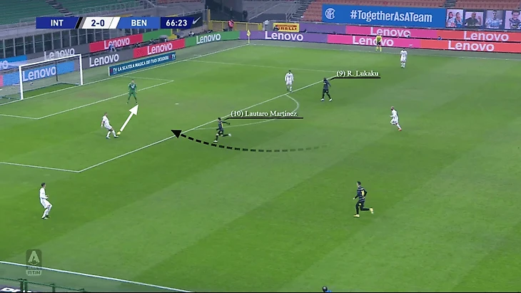 Видим, что Лукаку на фланге, а в свободную от бельгийца (и заодно от защитников) зону врывается Мартинес.
