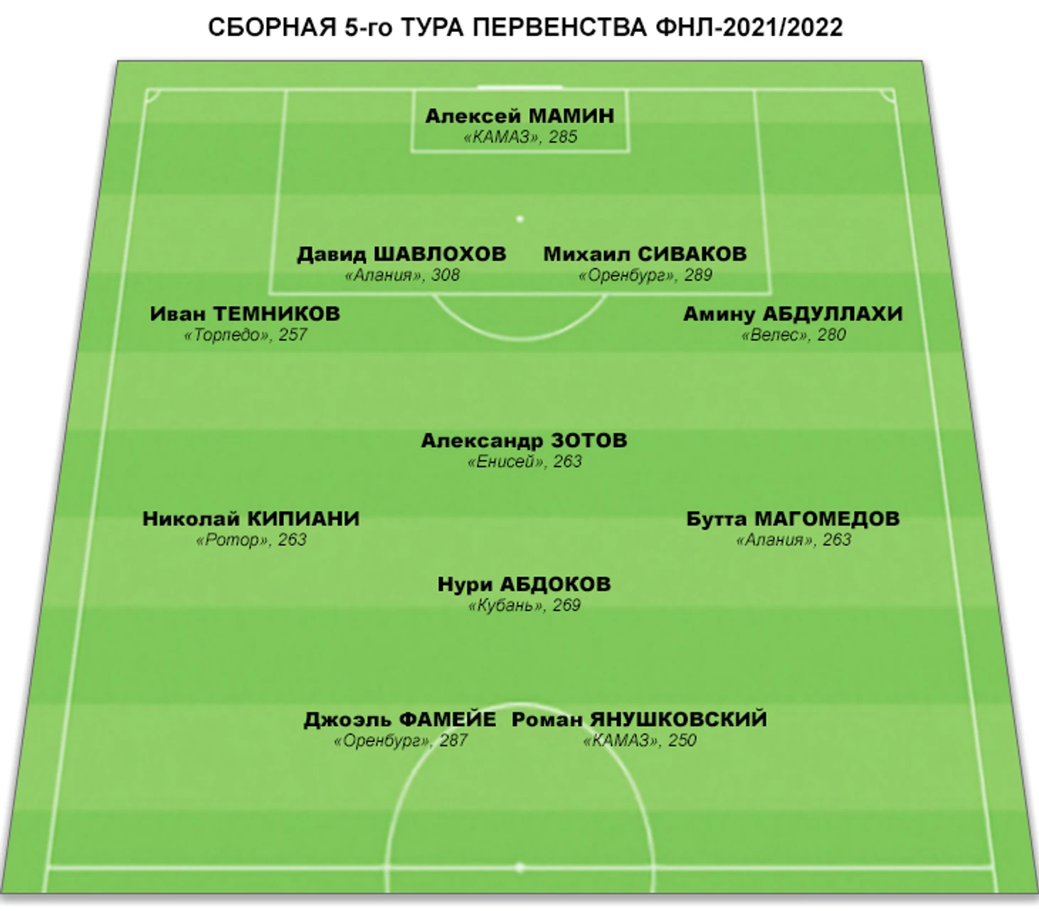 Символическая сборная 5-го тура ФНЛ. По два представителя «Алании», «КАМАЗа» и «Оренбурга»