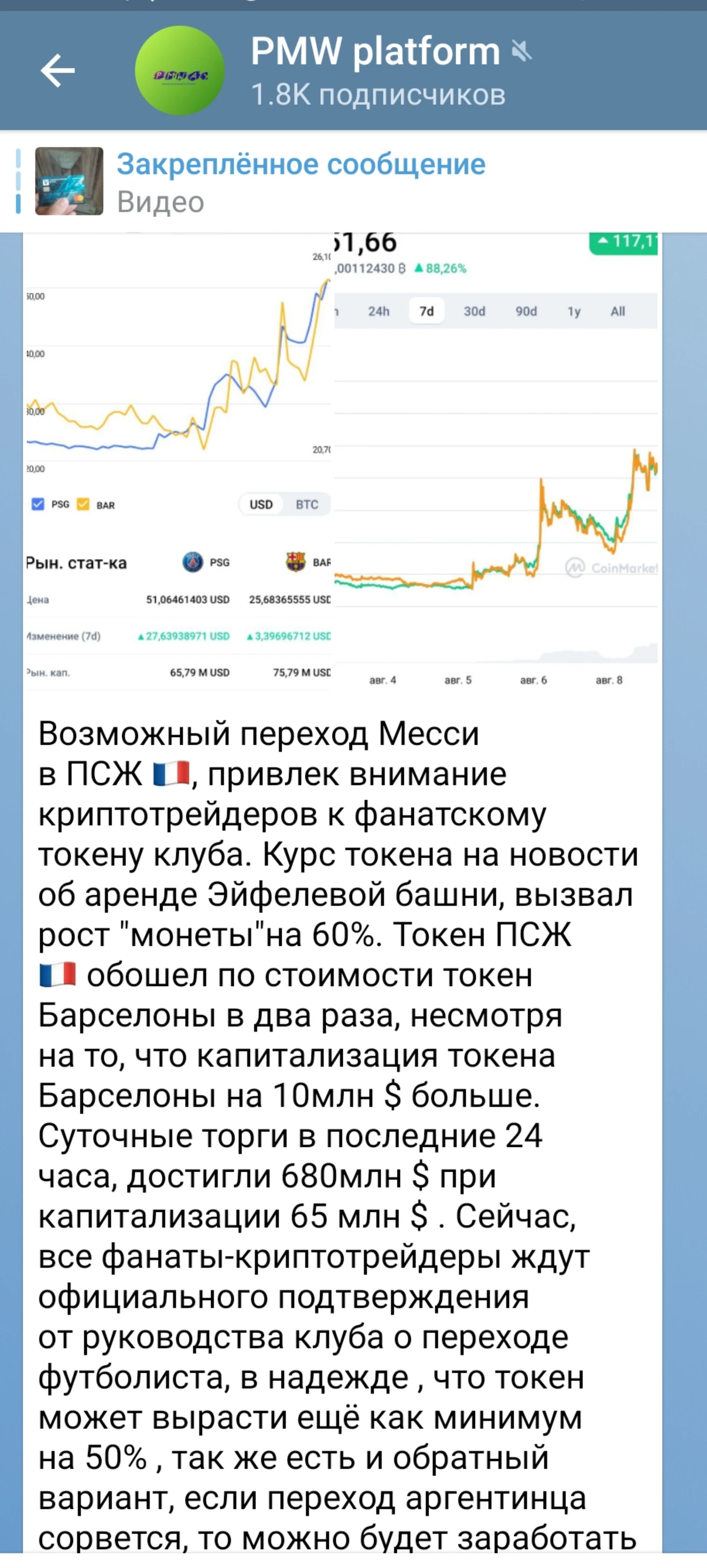 Новость о возможном переходе Лионеля Месси в ПСЖ взбудоражила не только футбольный мир , но и как это не странно мир финансов, а точнее криптовалютный финансовый мир. Токен (цифровые деньги) ПСЖ после новости о трансфере вырос в цене на 88% и продолжает рост , обогнав в цене такой же токен Барселоны почти в два раза. По данным сервиса PlatformMW обьем торгов токеном ПСЖ за последние сутки перевалил за 500 000 долларов.