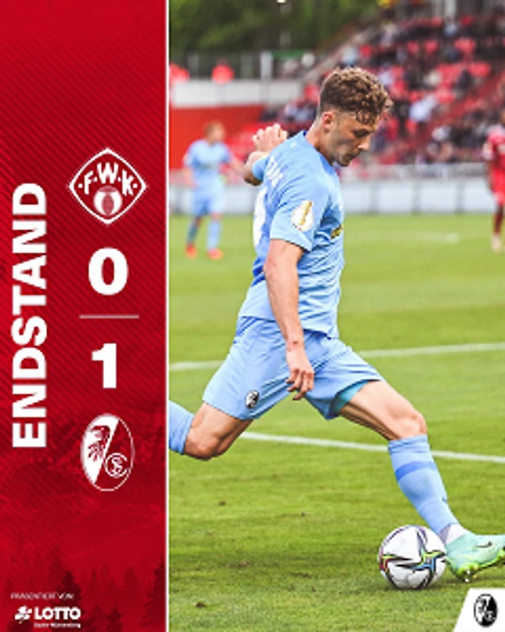 «Вюрцбург» времен тренера Михаэля Шиле показывал задорный атакующий футбол – много забивал, много пропускал. У нового тренера Торстена Цигнера пока не получается наладить игру. «Фрайбург» победил без особых проблем, Шмид забил «в раздевалку», этот гол остался единственным. Итоговый счет не должен вводить в заблуждение, гости играли с большим запасом и вполне могли забивать второй, «Вюрцбург» же с трудом доходил до штрафной соперника. Минимальная победа, как по счету, так по затраченным силам, позволяет «Фрайбургу» в десятый раз подряд пройти во второй раунд турнира. «Вюрцбург» третью из трех игр сезона 2021/22 проигрывает со счетом 0:1.