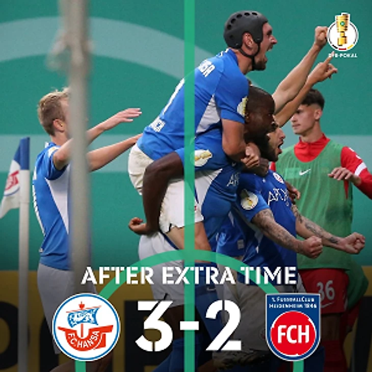 Основное время матча стало бенефисом защитника «Хайденхайма» Патрика Майнки. Он вывел гостей вперед, он же отметился автоголом, что позволило «Ганзе» выровнять положение. «Хайденхайм» смотрелся увереннее, и казалось, сумеет дожать соперника. Но в самом начале овертайма хозяева повели в счете. Команда Шмидта бросилась спасаться и добилась своего – Шиммер оказался точен на добивании. 2:2 на 108-й минуте. Но последнее слово осталось за «Ростоком». Вышедший на замену новобранец клуба Манси головой отправил мяч в сетку и привел «Остзеештадион» в экстаз. До серии пенальти оставались считанные мгновения.