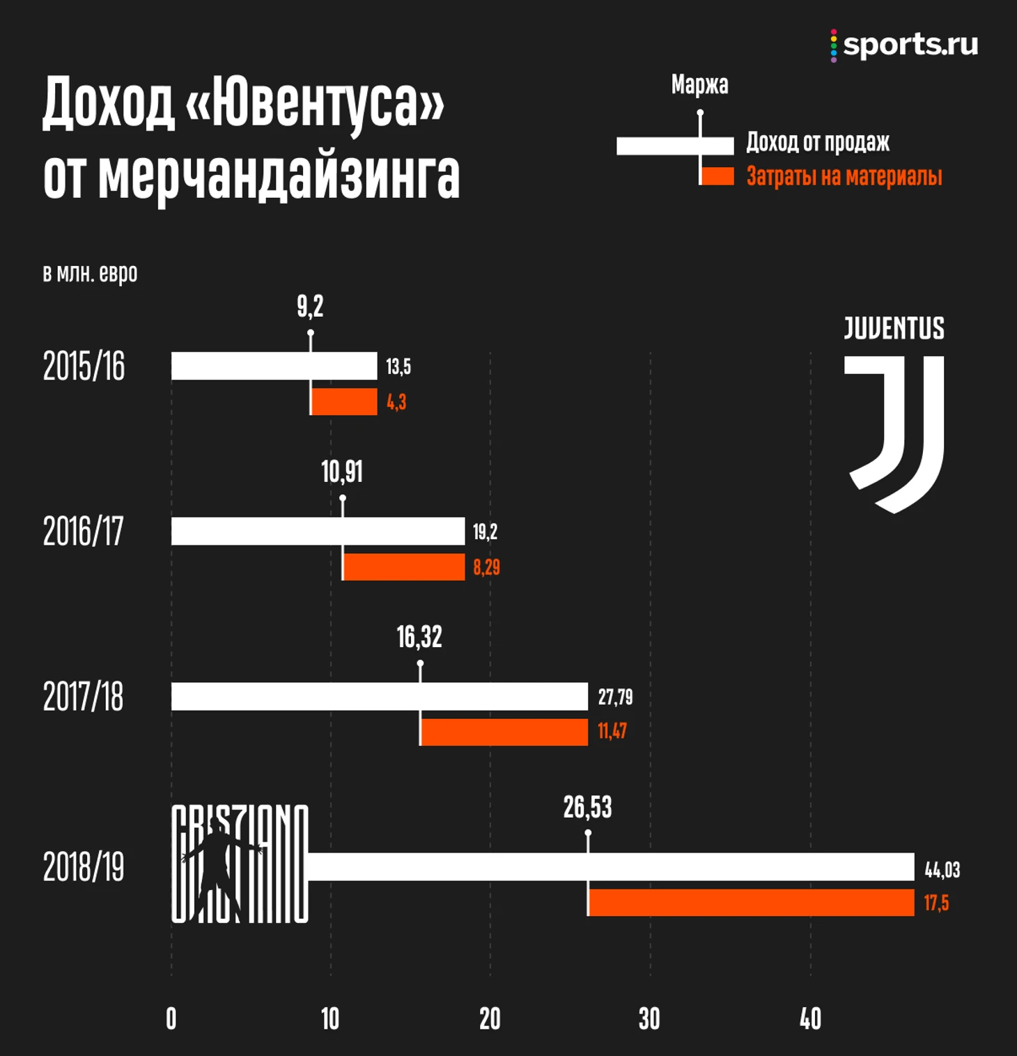 Давайте под конец посчитаем различные экономические и статистические показатели, на которые повлиял трансфер Роналду (чуть позже такой же подсчет можно будет сделать относительно Месси). Итак, за 5 месяцев на Инстаграм "Ювентуса" подписалось 18 млн человек (итого, под конец ноября сумма составляла около 30 миллионов подписчиков). Доходы от мерчандайзинга резко подскочили (изображено на диаграмме снизу). Речи о том, чтобы отбить трансфер таким образом, даже идти не может, но сумма действительно большая.