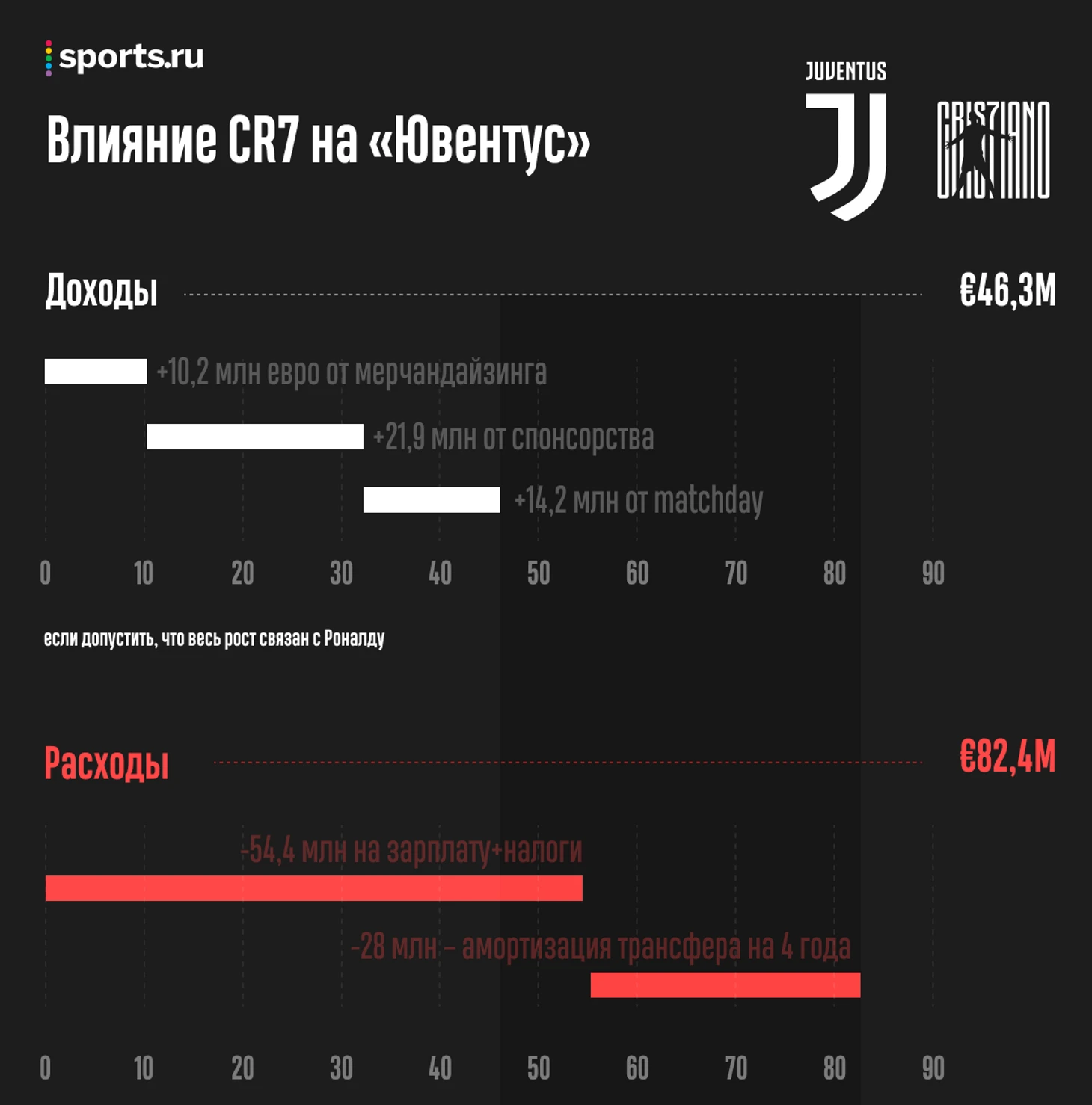 Вообще, на Sports.ru проводилось целое исследование по этому вопросу (читайте по ссылке: https://www.sports.ru/football/blogs/2612870.html). Мы лишь возьмем оттуда еще одну очень полезную диаграмму. В общем, трансфер, конечно, не окупился. Но повысилась узнаваемость бренда, стоимость рекламы, контракты, подписные бонусы, в клуб охотнее идут новые игроки. В целом, на имидж Серии А и отдельно "Ювентуса" этот трансфер повлиял очень сильно. Посмотрим, как сможет изменить все эти статистические показатели Лионель Месси в ПСЖ.