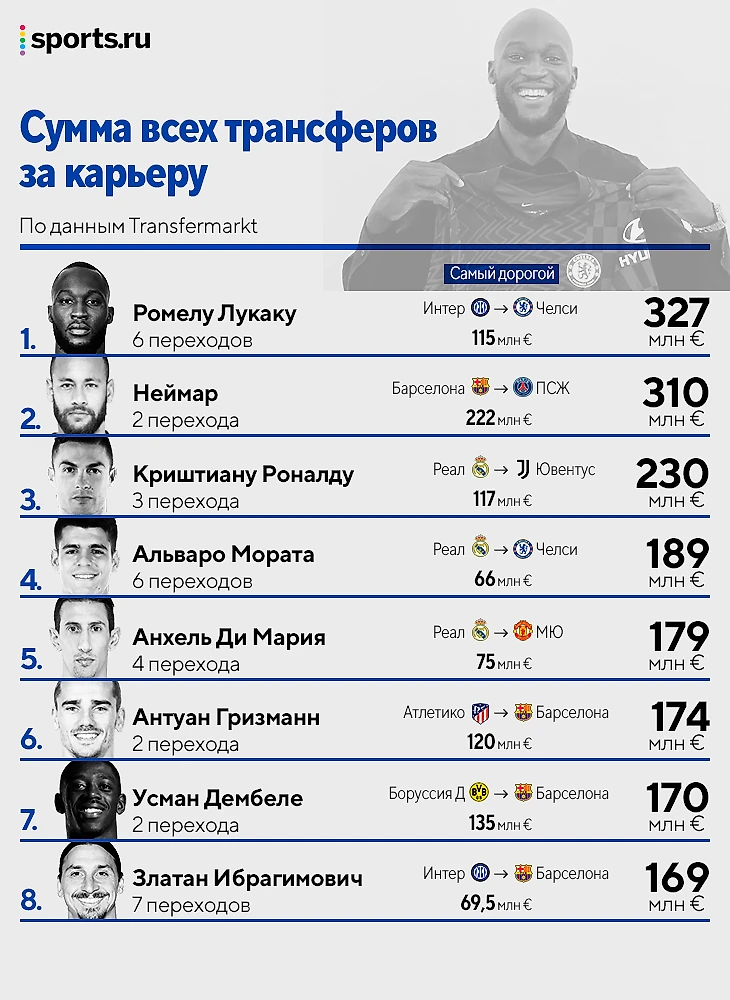 Лукаку – самый дорогой игрок по сумме трансферов за карьеру (327 млн). Обошел Неймара и Роналду
