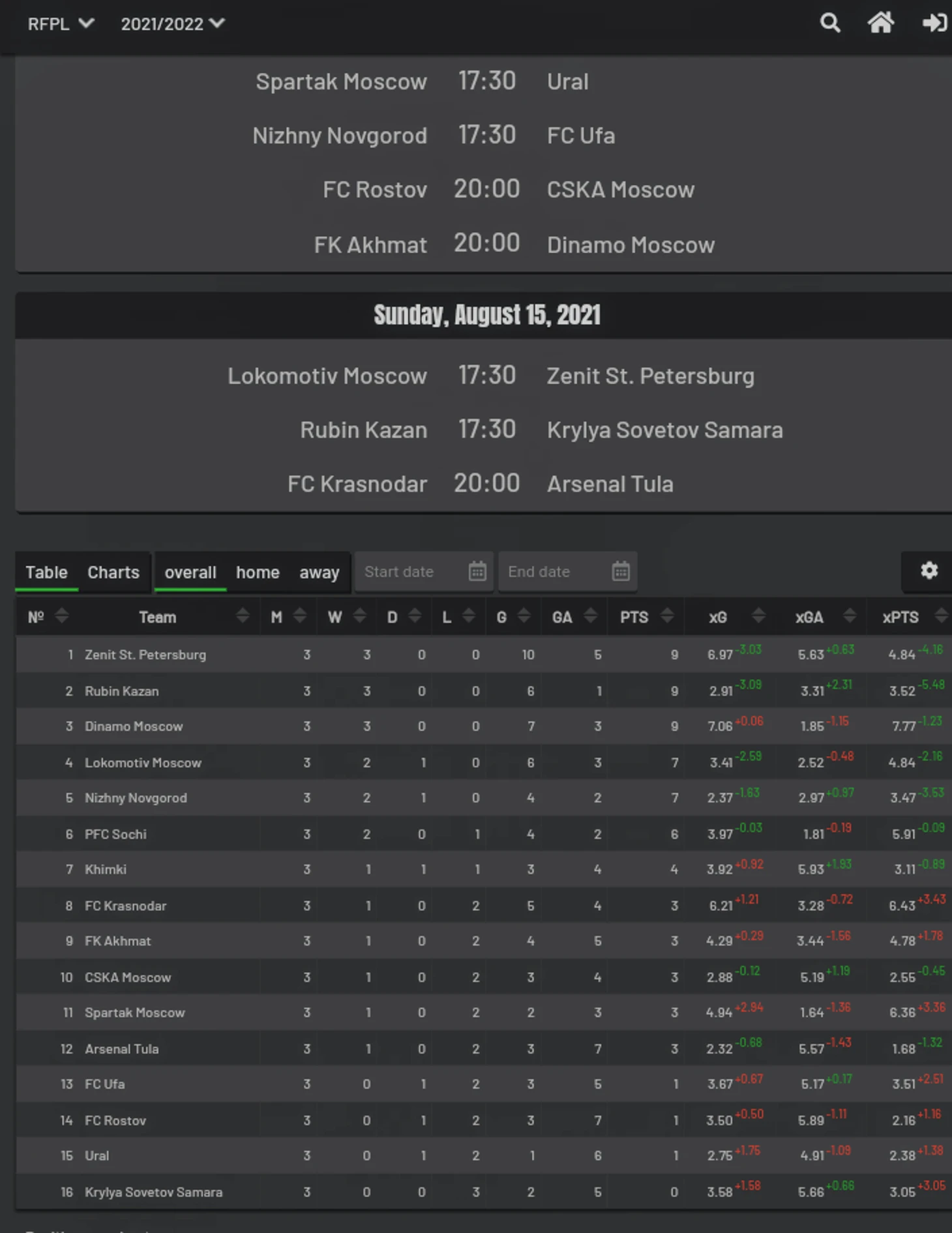 Если взглянуть на таблицу ниже, то можно заметить, что "Спартак" существенно недобирает очков на старте чемпионата. Именно москвичи идут на третьем месте в РПЛ по количеству ожидаемых очков (xPTS), уступая по этому показателю лишь "Краснодару" и "Динамо". 6,34 xPoints у КБ против 6,43 у быков и 7,77 у подопечных Сандро Шварца. К слову, один из промежуточных лидеров - "Рубин" смог набрать лишь 3,52 xPTS.