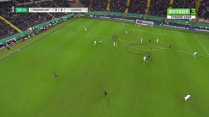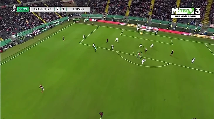 После подобных действий пострадал и «Айнтрахт» в Кубке Германии. Отличаются только детали. Анхелиньо с фланга делал пас на Вернера, опасно открывшегося около штрафной и утащившего за собой игрока соперника. Немец перед этим видел движение Ольмо и неожиданно пропустил на него мяч — испанец без давления забил после удара из зоны перед штрафной.