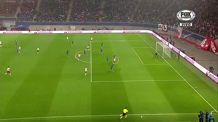 На 49-й минуте Нкунку увидел открытого Лаймера левее, где создалась ситуация два в один против Сантоса. Дриусси видит момент паса на австрийца и бежит на перехват, но Лаймер пропускает мяч на Забитцера и не выключается, а сразу бежит за спину левому защитнику «Зенита». Дриусси не готов к этому и не успевает за движением Лаймера — Ракицкому сложно перестроиться в последний момент и вовремя накрыть Лаймера.