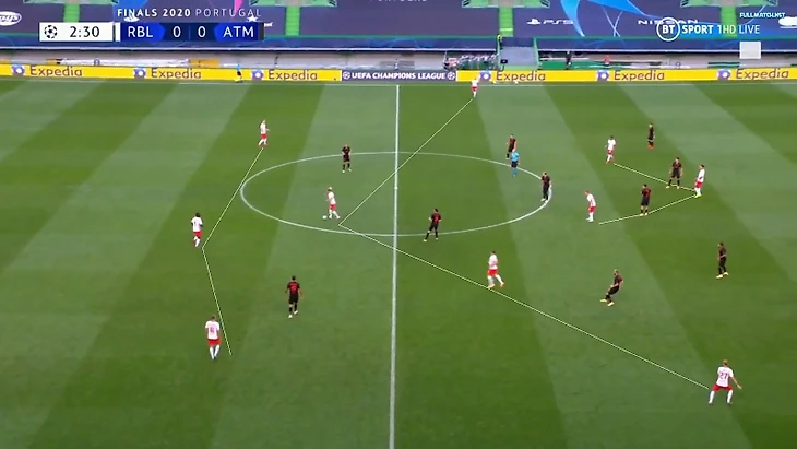 В обороне «Лейпциг» перестраивался на 4-4-2 — Лаймер уходил в центр, Забитцер становился правым полузащитником, а Клостерманн — правым защитником. Компактная структура без мяча становилась проблемой для «Атлетико» — любая команда с не самой стабильной позиционной атакой начинает искать более простые варианты для доставки мяча в штрафную.