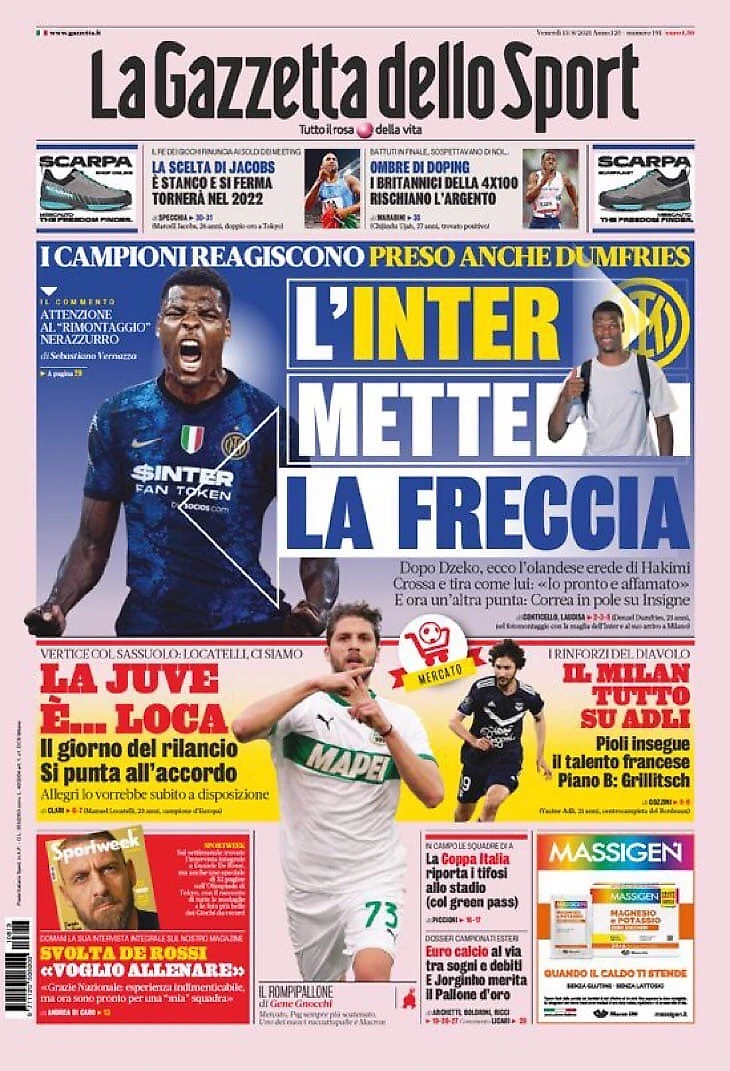 «Интер» ставит стрелу. Заголовки Gazzetta, TuttoSport и Corriere за 13 августа