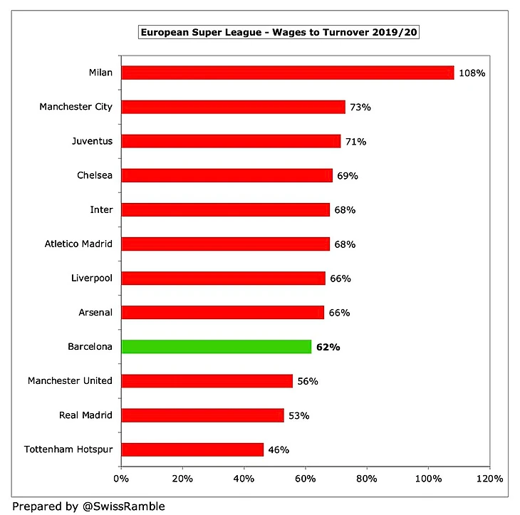 Тут мадридцам далеко до «Барсы» (432 млн против 731 в сезоне-19/20), но и отрыв от «третьего места» составляет 28 млн. УЕФА вроде как планирует заменить ФФП на потолок зарплат и он как раз будет примерно на отметке 70% от оборота.