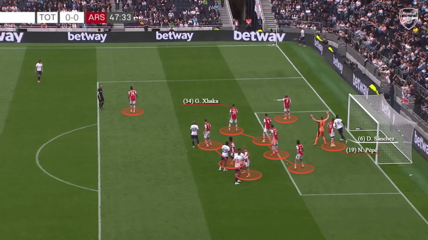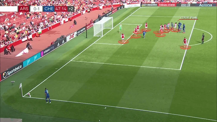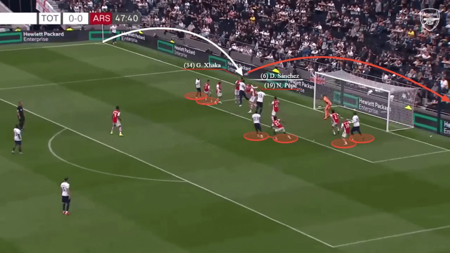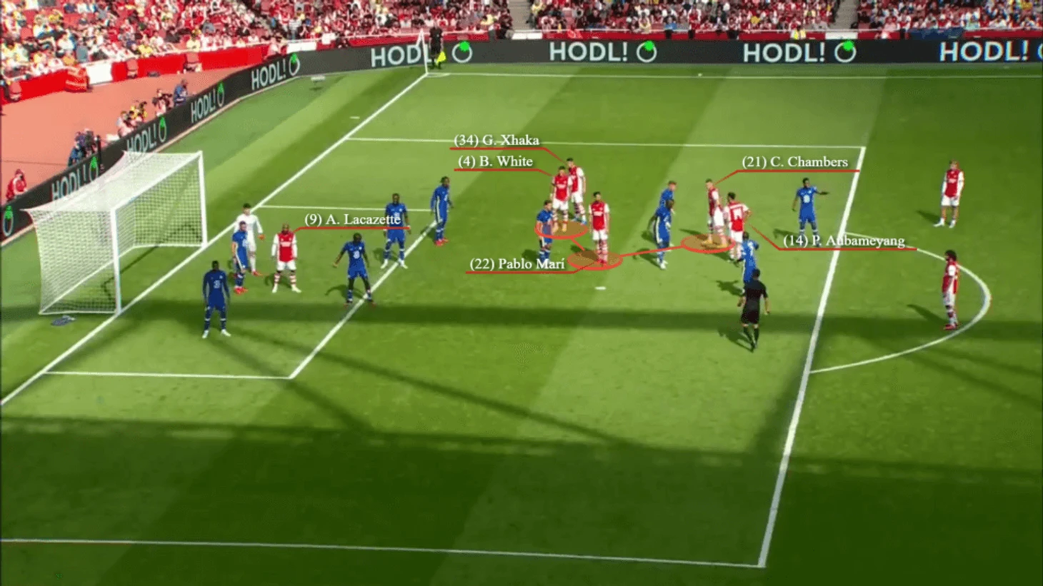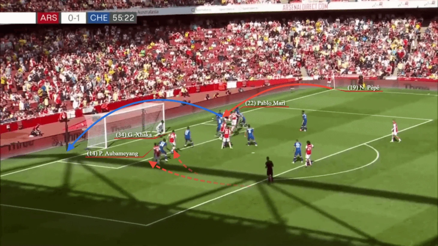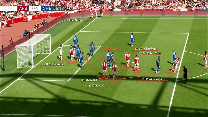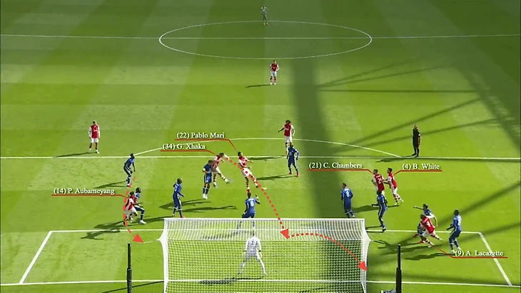 Во вратарской один Ляказетт. Оба центральных защитника (Уайт и Мари) и Чемберс готовы врываться. Джака за пределами вратарской зоны, как и Обамеянг. Оба набегают, как только Пепе делает подачу.