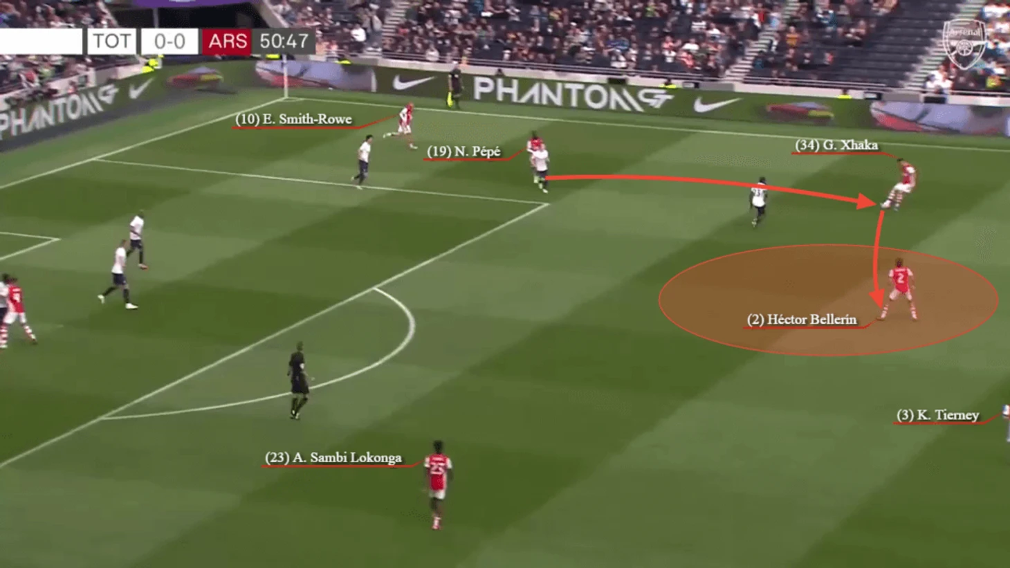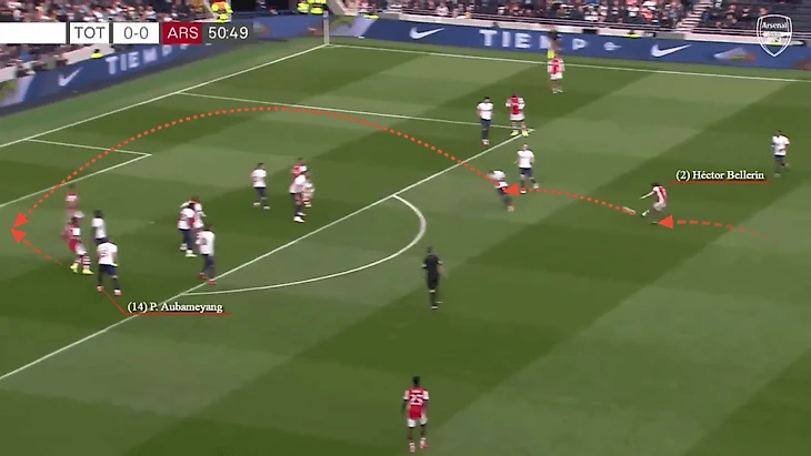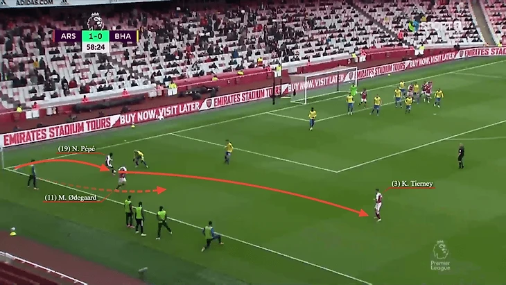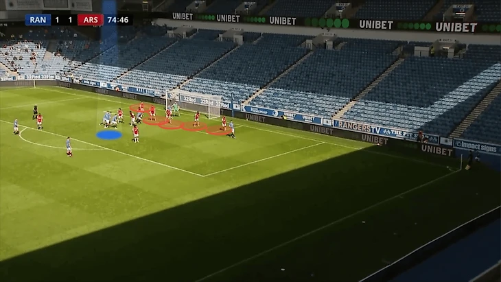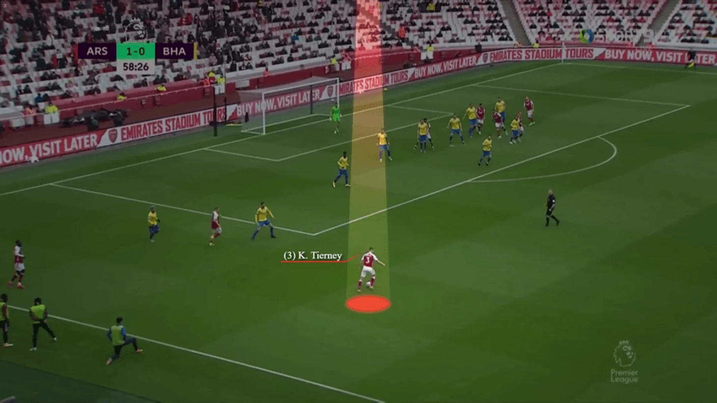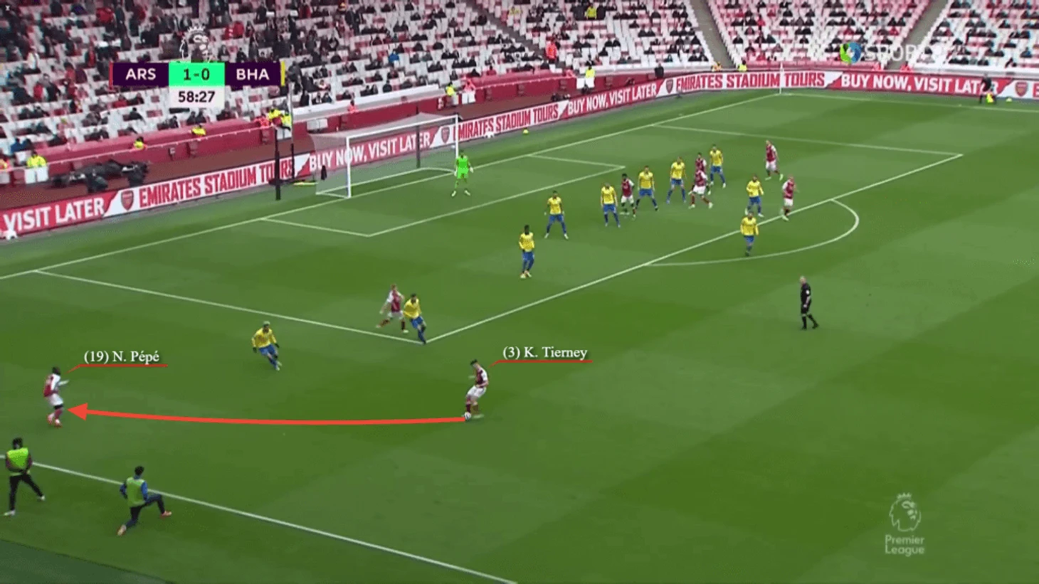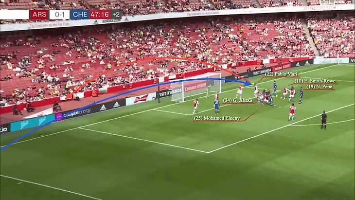 Во вратарской один Ляказетт. Оба центральных защитника (Уайт и Мари) и Чемберс готовы врываться. Джака за пределами вратарской зоны, как и Обамеянг. Оба набегают, как только Пепе делает подачу.