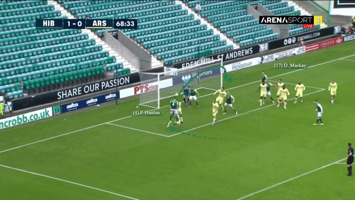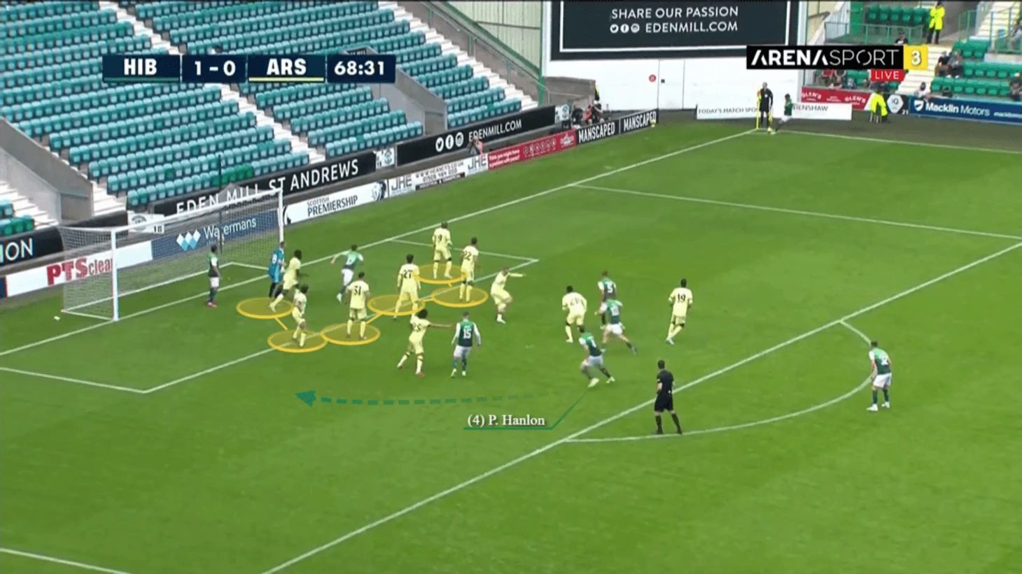 В двух предсезонных матчах с шотландскими командами канониры пропустили 4 мяча, 3 из которых с угловых. Оборона выглядела несколько неорганизованной. 4 игрока на линии вратарской, Ляказетт на углу, Парти догоняет открывающегося игрока соперников. В это время Хэнлон в гордом одиночестве забегает на дальнюю штангу.
