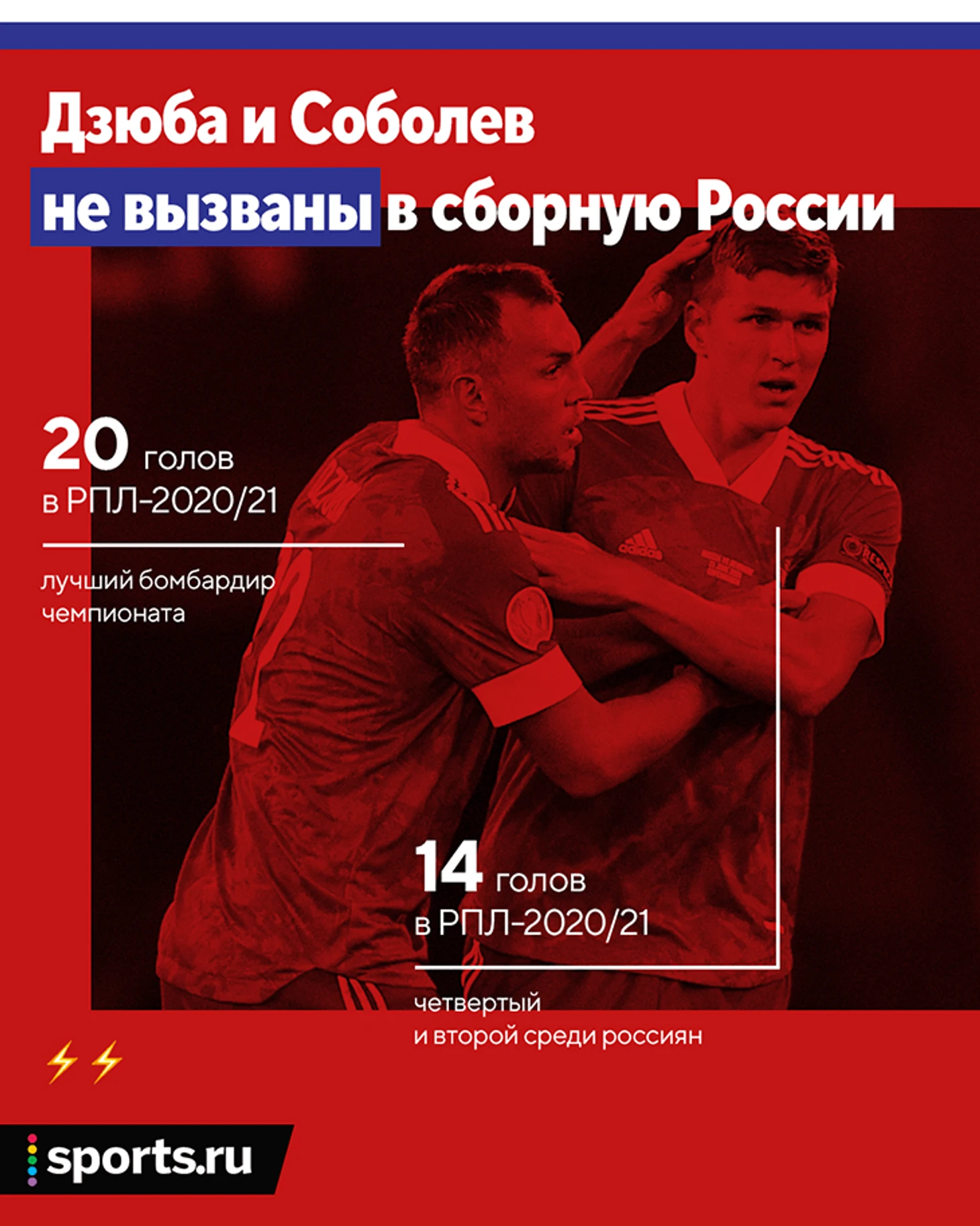 На самом деле это сенсация только с точки зрения статуса – в том числе из-за количества голов Дзюбы и Соболева в прошлом сезоне. Плюс Дзюба был капитаном при Черчесове, а Соболев был второй атакующей опцией на Евро. Например, он вышел в матче с Данией, когда нужно было спасать, и заработал пенальти.