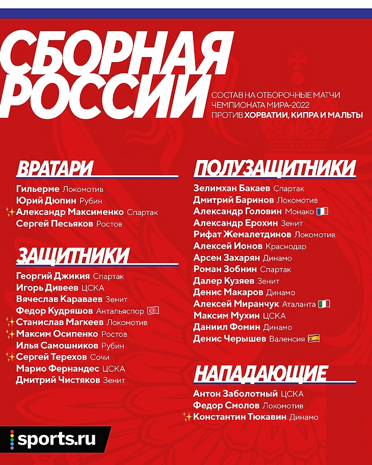 В понедельник Валерий Карпин назвал игроков, которые будут готовиться к сентябрьским матчам квалификации ЧМ-2022 против Хорватии, Кипра и Мальты.