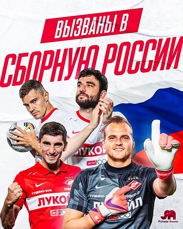 Среди них четыре футболиста «Спартака»: вратарь Александр Максименко, защитник Георгий Джикия, а также полузащитники Роман Зобнин и Зелимхан Бакаев.