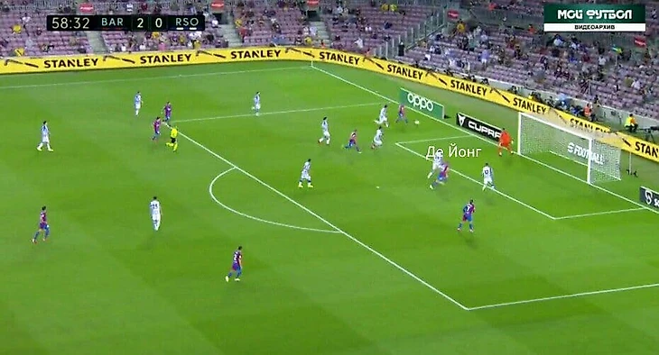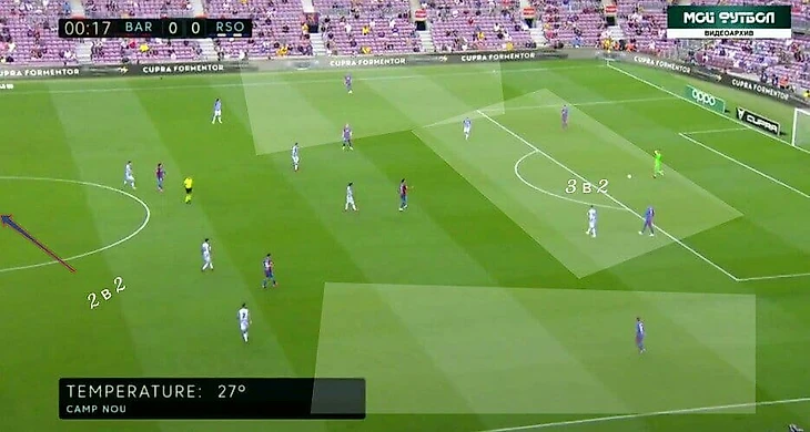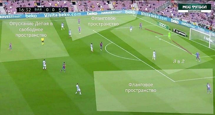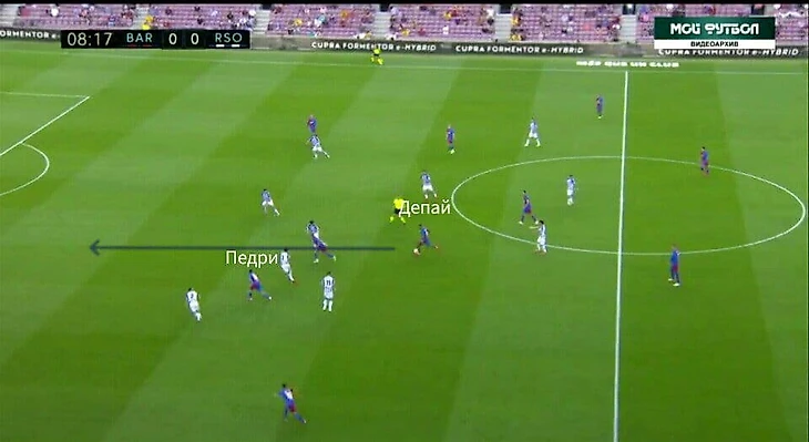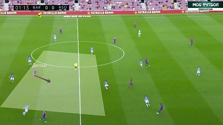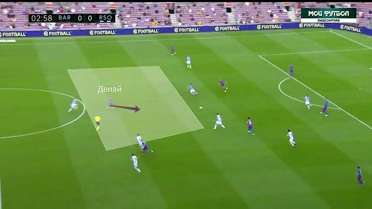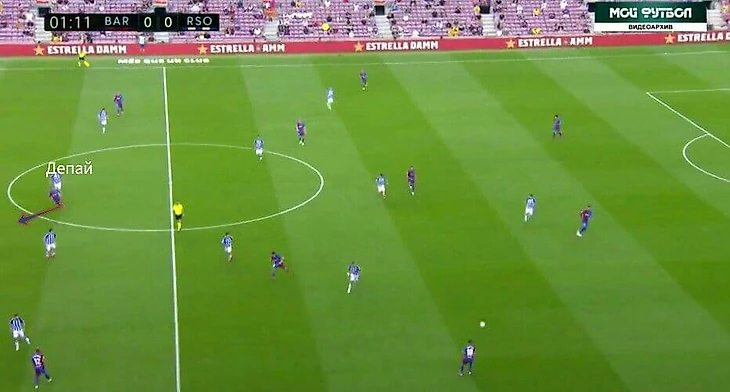 А ещё в этом матче очень часто Барса старалась играть через Нето. Не знаю, это было ситуативно или это был способ выманивать соперника для прессинга, но как минимум это было интересно. За счёт Нето создавалось численное преимущество 3 в 2 при билд-апе. Плюс к этому соперник оставлял пространства во фланге, и опускания Депая создавали ещё большую головную боль для Реала Сосьедада.