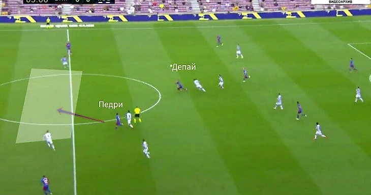 Ещё одна сильная сторона Барсы в позиционных атаках - подключения инсайдов - Педри и Де Йонга за спину защитной линии и в штрафную соперника, как и в прошлом сезоне. Педри и Де Йонг - очень выносливые и на протяжении всего матча могут совершать такие рывки в пространства между защитниками. Депай/Гризманн уводят защитников соперника и освобождают пространства, а инсайды этим пользуются и вбегают в эти оставленные пространства. Ещё они подключаются в штрафную при подачах/прострелах с фланга. Это всё даёт большие преимущества атакующему потенциалу Барсы.
