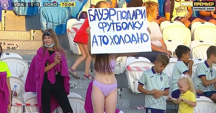 Болельщица «Уфы» пришла на матч в нижнем белье и с плакатом «Бауэр, подари футболку, а то холодно». Он подарил