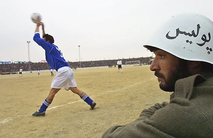 Во время первого правления талибов на стадионе проводились казни в перерыве между таймами. На фото афганский полицейский следит за матчем между «Кабул Юнайтед» и командой Международных сил содействия безопасности (ISAF, войсковой контингент НАТО в Афганистане). На арене, где когда-то проводились казни, пришло посмотреть футбол не меньше 40 тысяч зрителей.