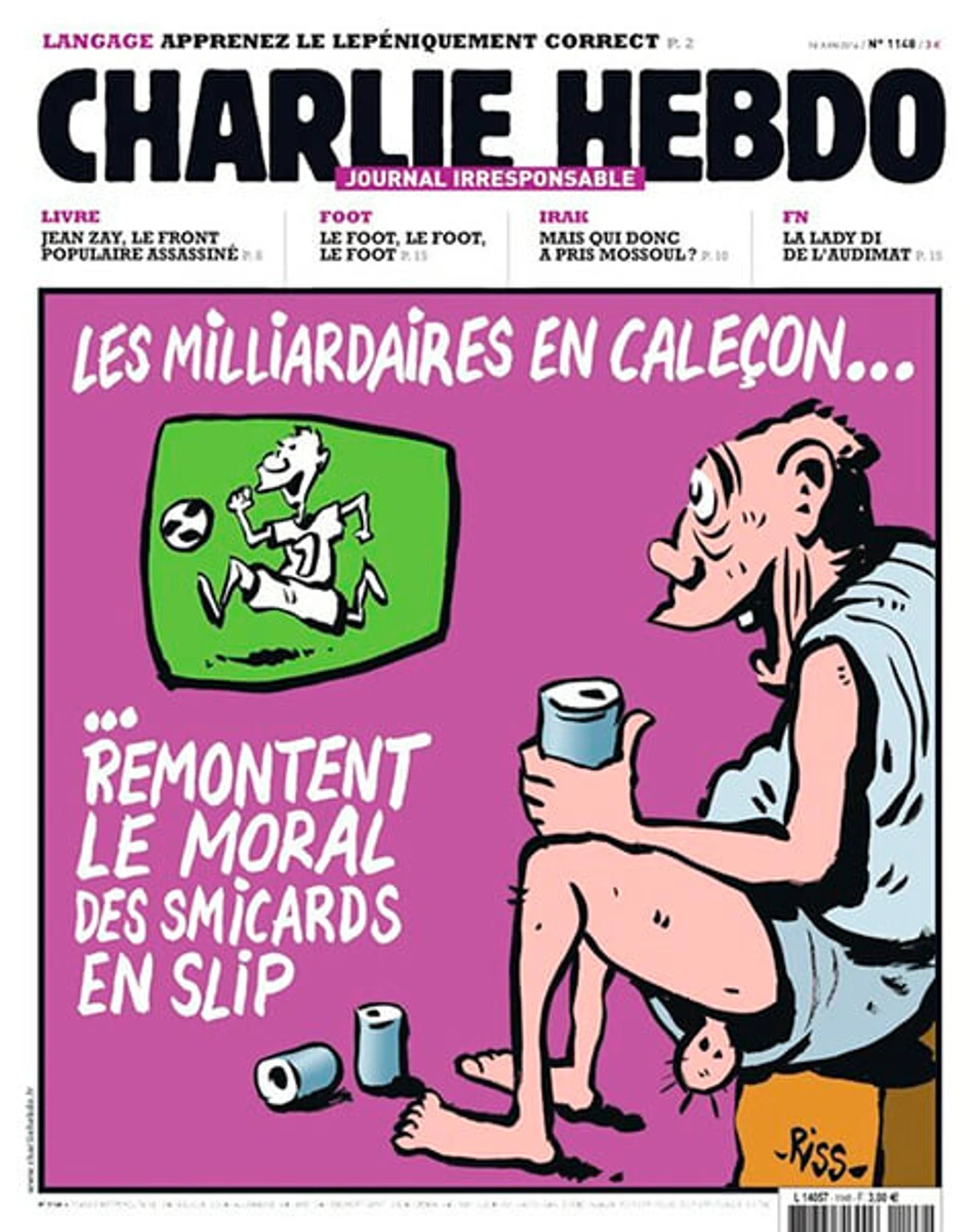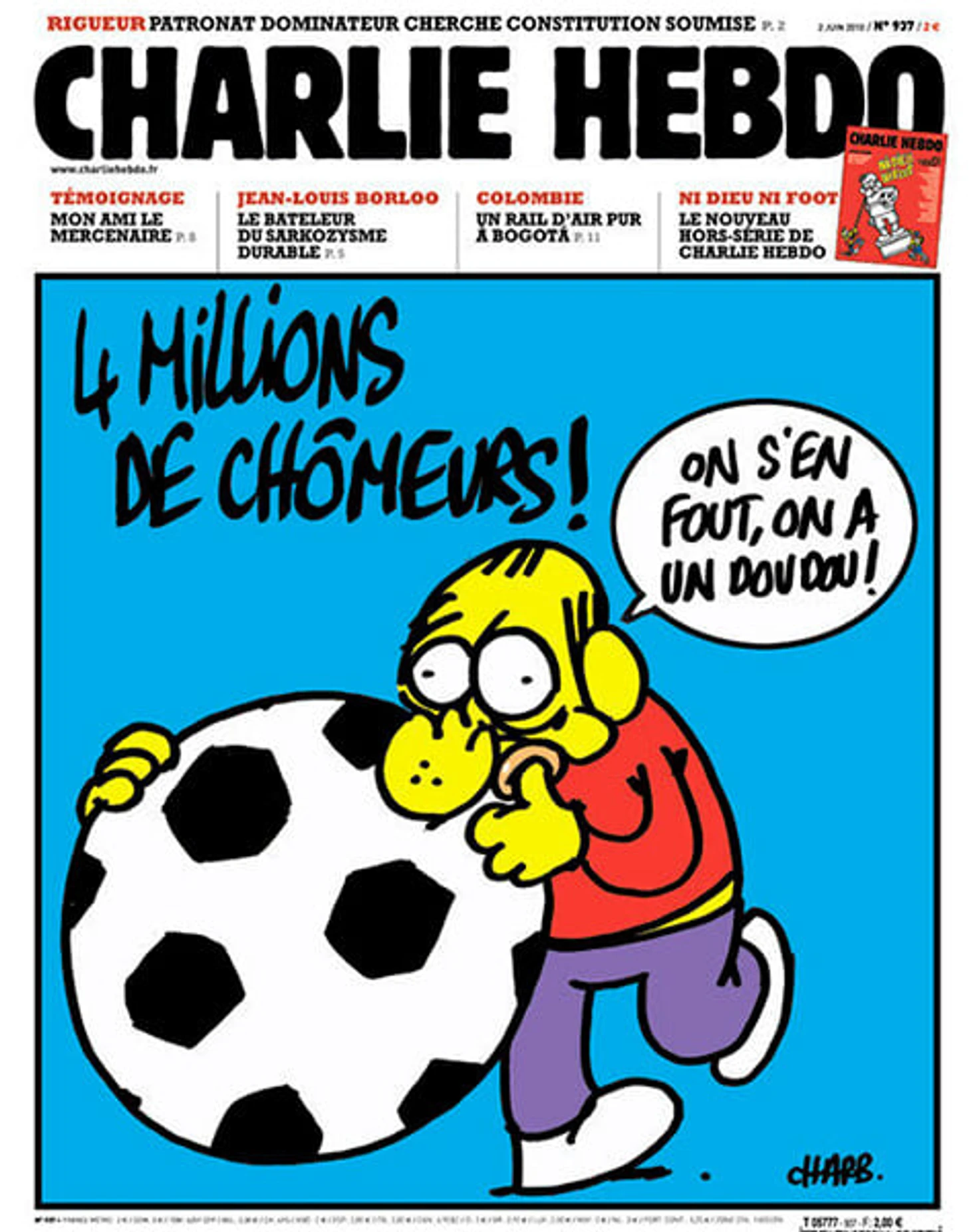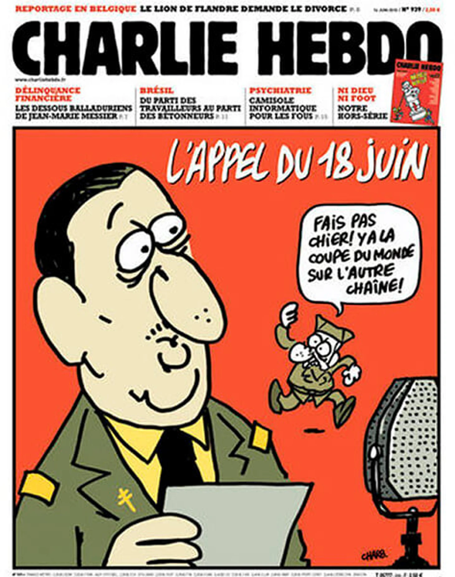 В день празднования юбилея речи в 2006-м французы играли на ЧМ с Южной Кореей. С де Голлем у Charlie Hebdo тоже давние счеты – в середине 80-х его прародителя, журнал Hara-kiri Hebdo, закрыли через суд из-за шутки про авторитарного экс-президента Франции. Открылся журнал уже под новым названием. И вот месть от карикатуристов: «Не беси! На другом канале сейчас чемпионат мира!»