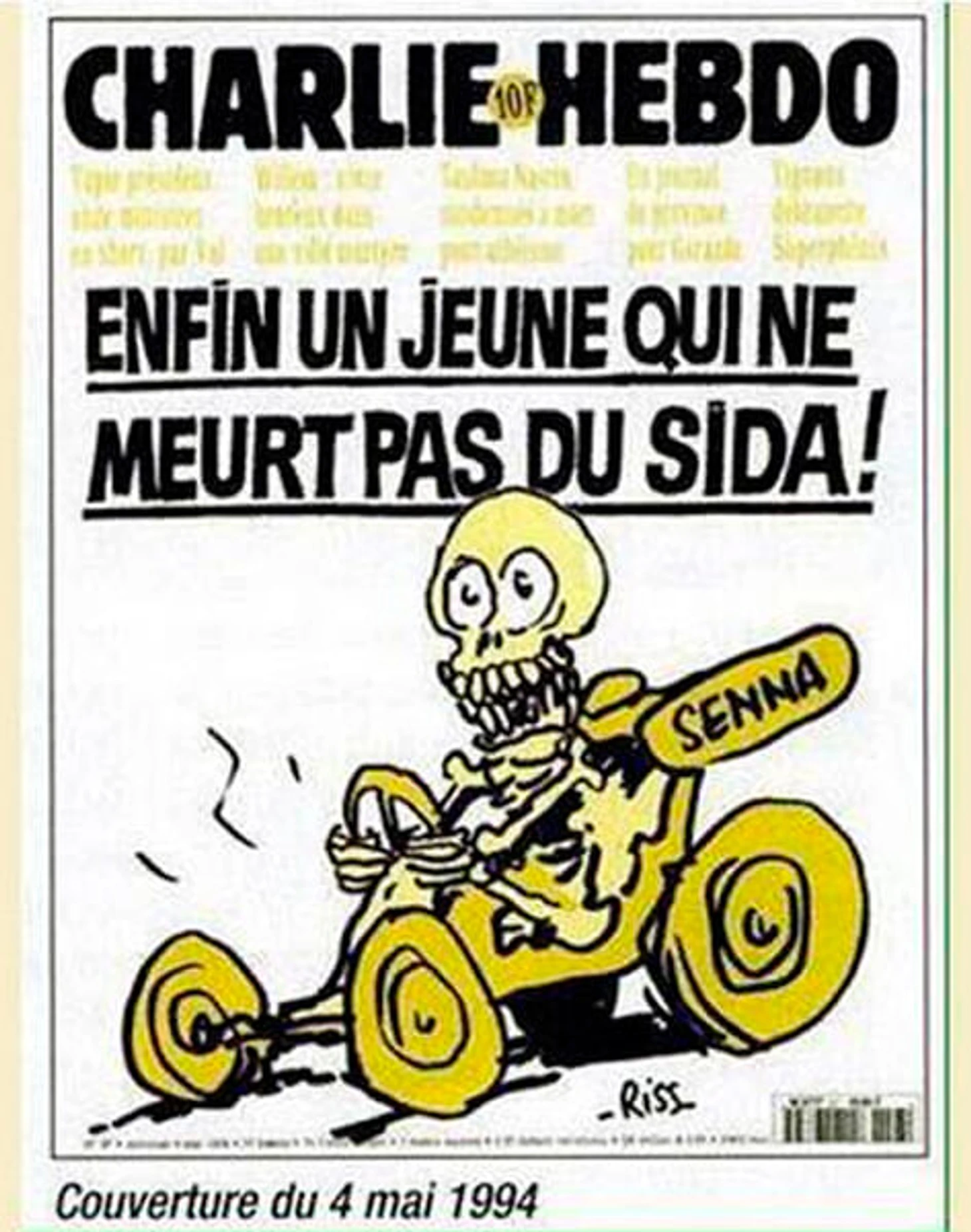 Май 1994-го. Гибель Айртона Сенны на Гран-при Сан-Марино. В то время СПИД был самой важной и громкой темой в мире – страшной болезнью, отнимавшей жизни молодых людей. А Charlie Hebdo уже тогда умел объединять самые обсуждаемые темы в скандальные обложки: