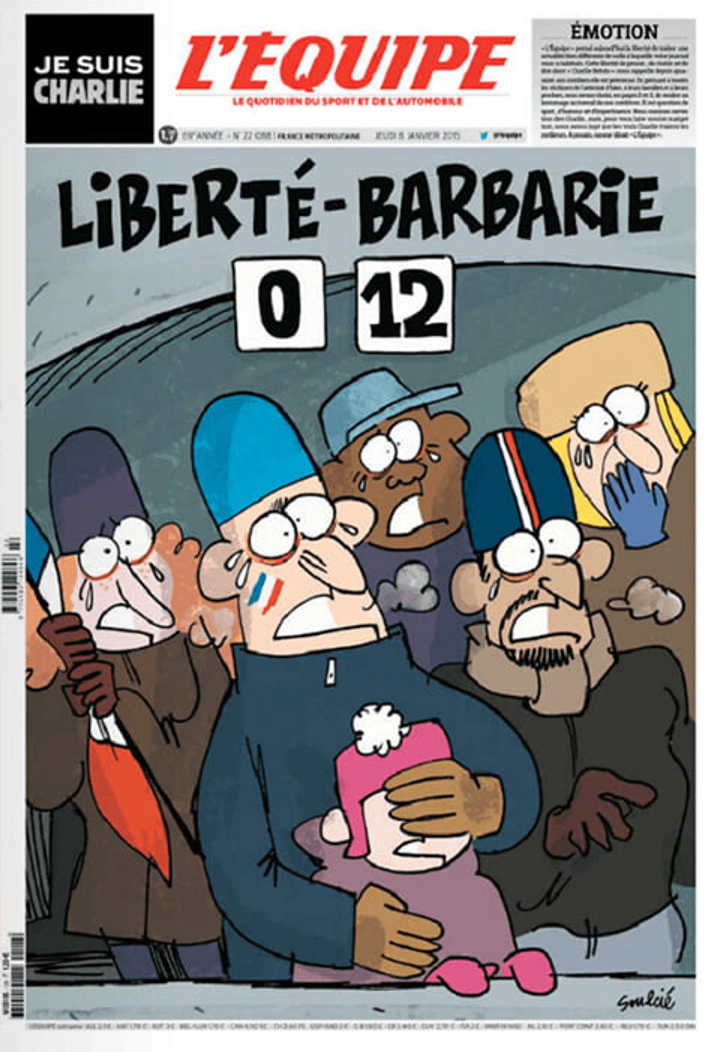 Charlie Hebdo выпустил очень много едких карикатур, которые высмеивали футболистов, болельщиков и спортивную журналистику. Однако когда в редакции случилась трагедия, главная спортивная газета страны L’Equipe посвятила журналу обложку.