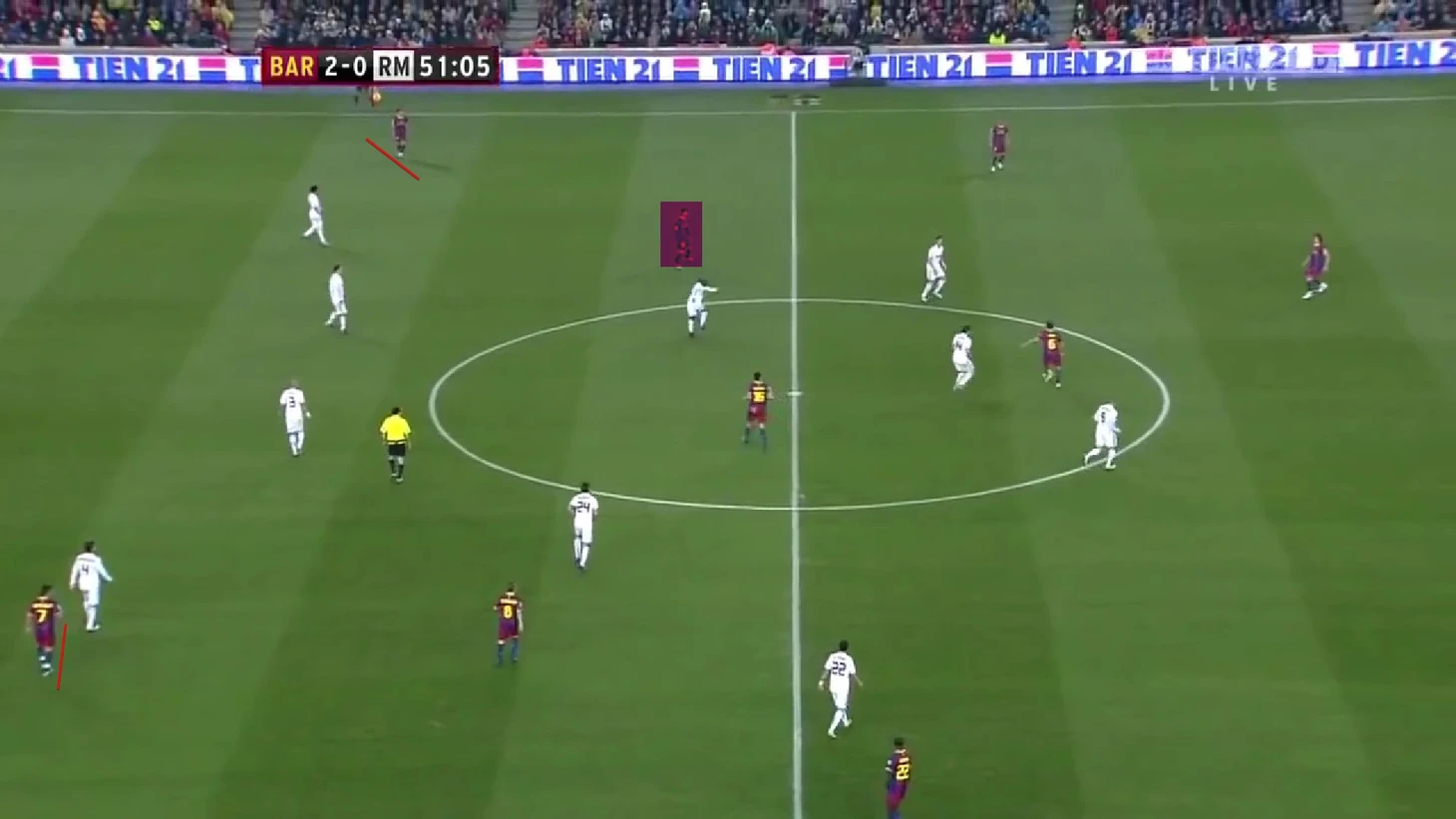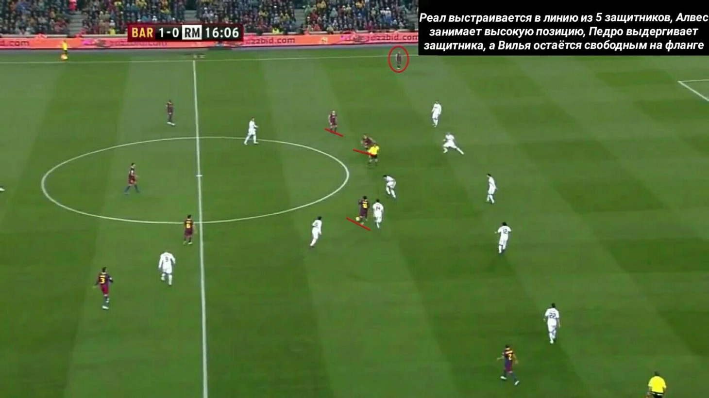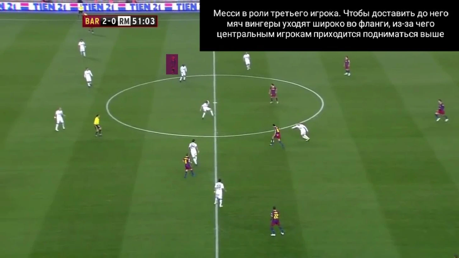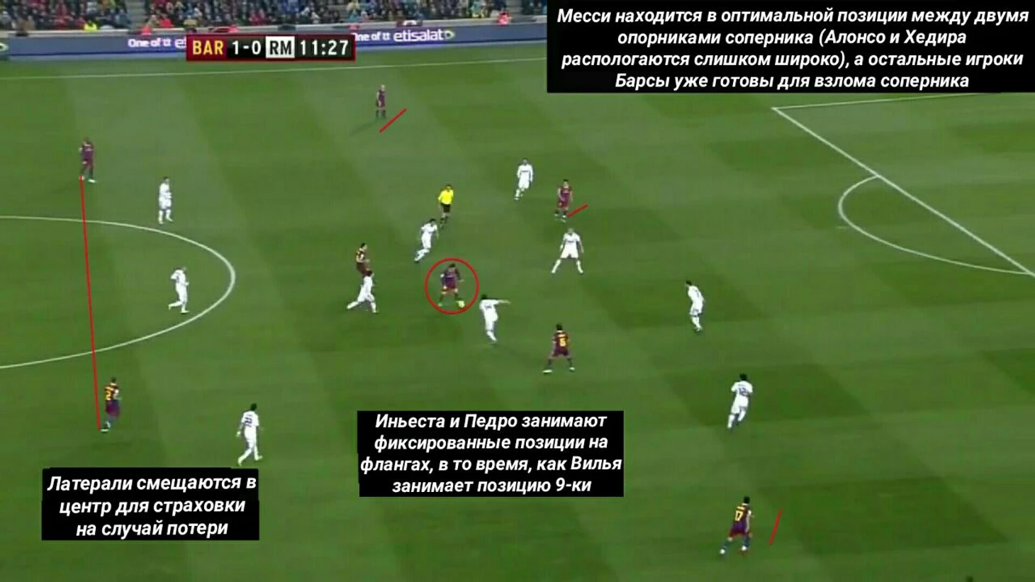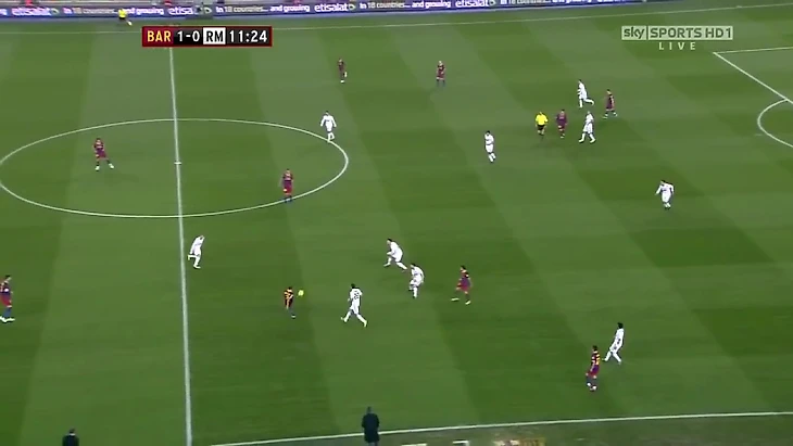 Паника в обороне «Реала» вызвана тем, что Пепе ушел на 70 метров от своих ворот за Месси, который играл ложную девятку, но также это стало возможным благодаря тому, что вингеры держали широкие позиции и не давали «Мадриду» распологаться более компактно при обороне.