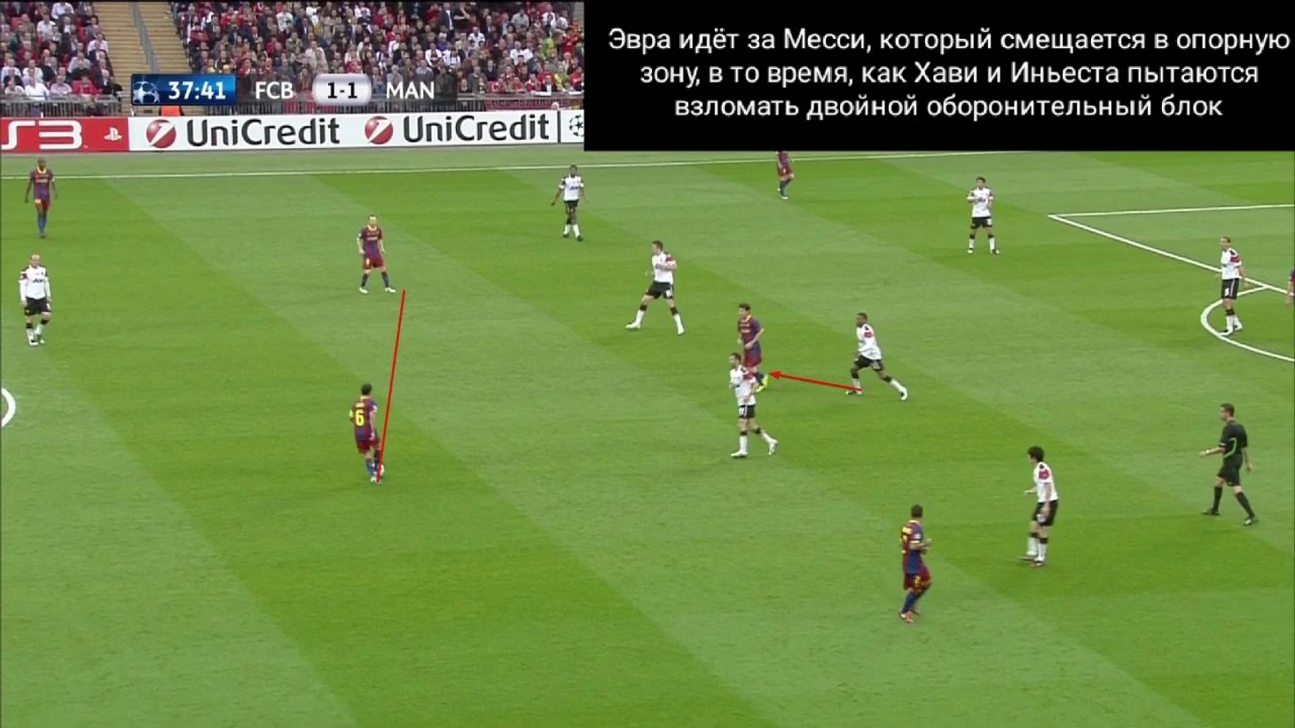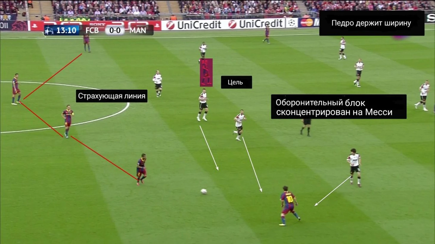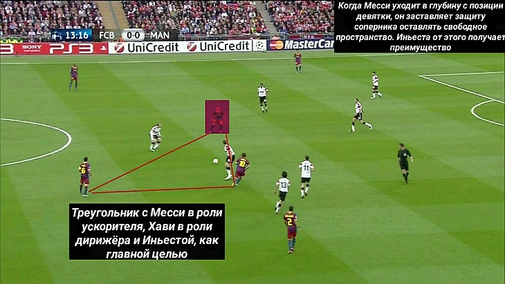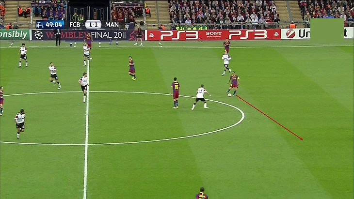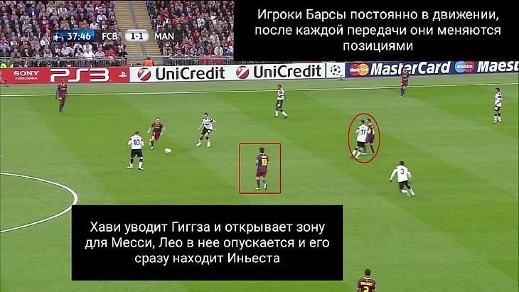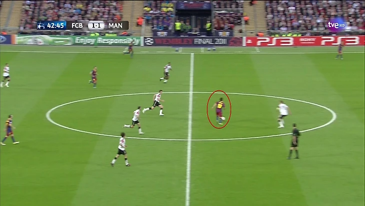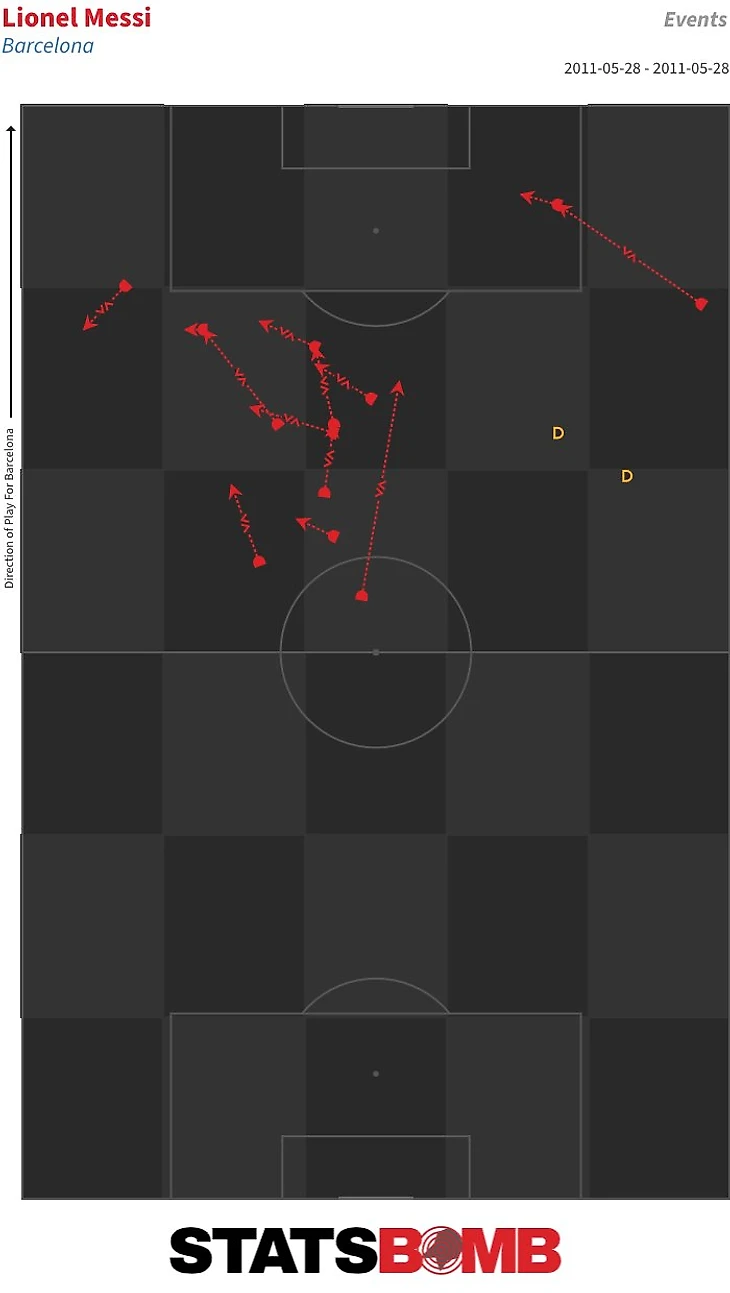 В этом финале игроки «Барселоны» отдали 130 передач на Месси. Это беспрецедентный случай. Постоянное позиционное преимущество вело к тому, что игра шла к Месси, а не исходила от него.