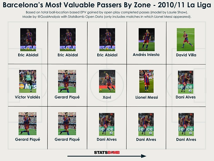 Это также был сезон, когда взаимодействия Месси и Дани Алвеса были наиболее активными (498 передач)