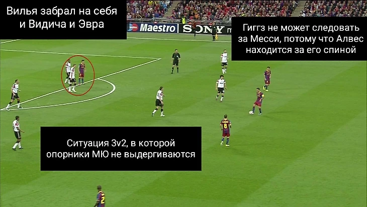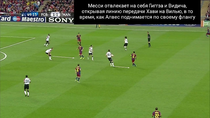 Месси уходит в глубину с позиции девятки, его зону заполняет Вилья, Педро уже привычно создаёт ширину, Дани Алвес поднимается выше по своему флангу, чтобы: 1. Заполнить освободившееся пространство от Вильи; 2. Отвлечь на себя Гиггза.