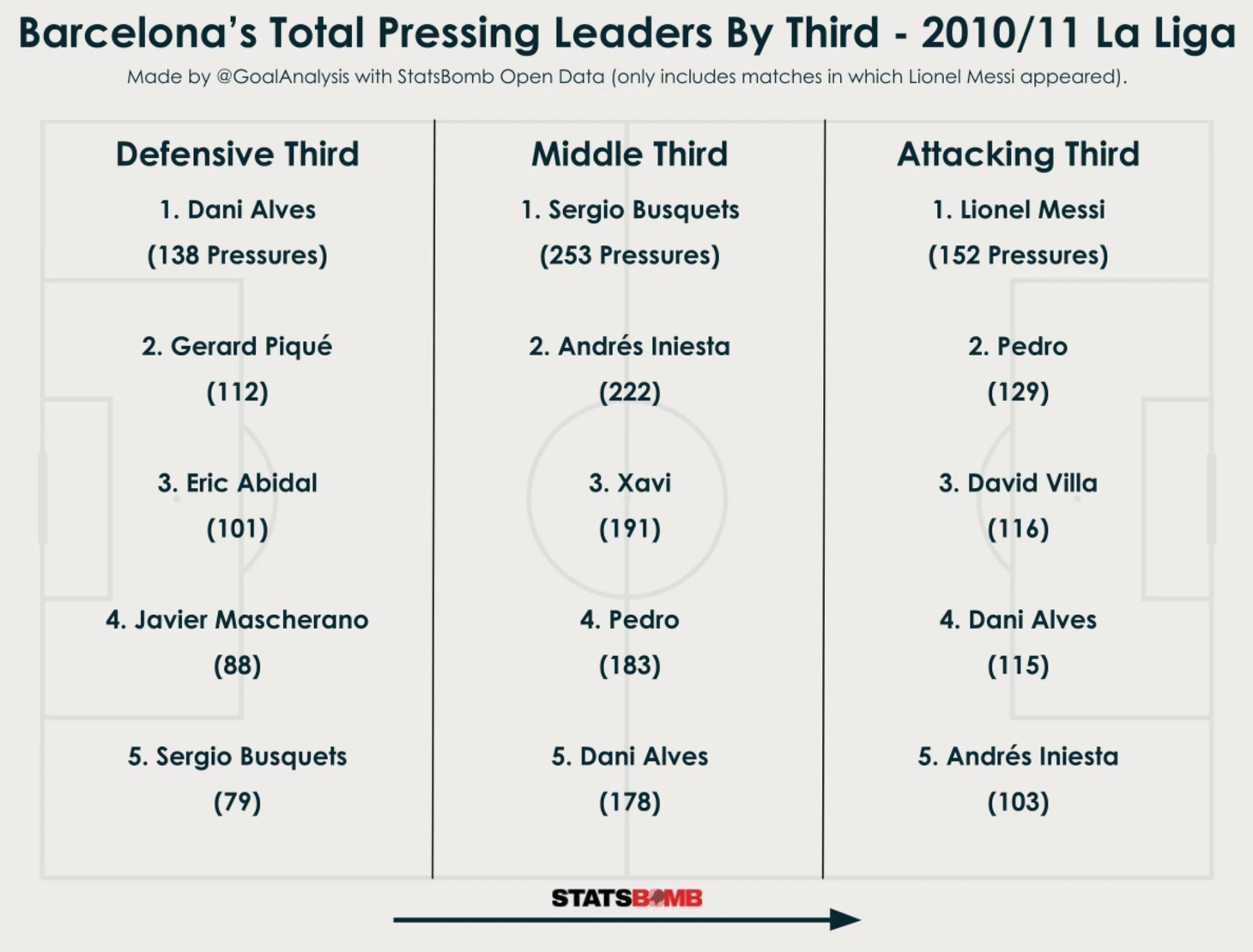 Невозможно игнорировать тот факт, что после потери мяча, «Барса» моментально его возвращала. Команда концентрировала всю свою оборонительную деятельность в центре поля, а лидерами давления были Алвес, Бускетс и Месси.