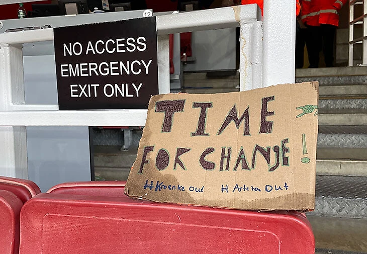 У кромки поля один из молодых болельщиков «Арсенала» держал картонку с рукописным «Время что-то менять. Kronke out, Arteta out»: «Команда потеряла мотивацию, и мне не кажется, что тренер контролирует раздевалку. Игроки не играют за него, и фанаты тоже. И Артета, и Кронке должны уйти».