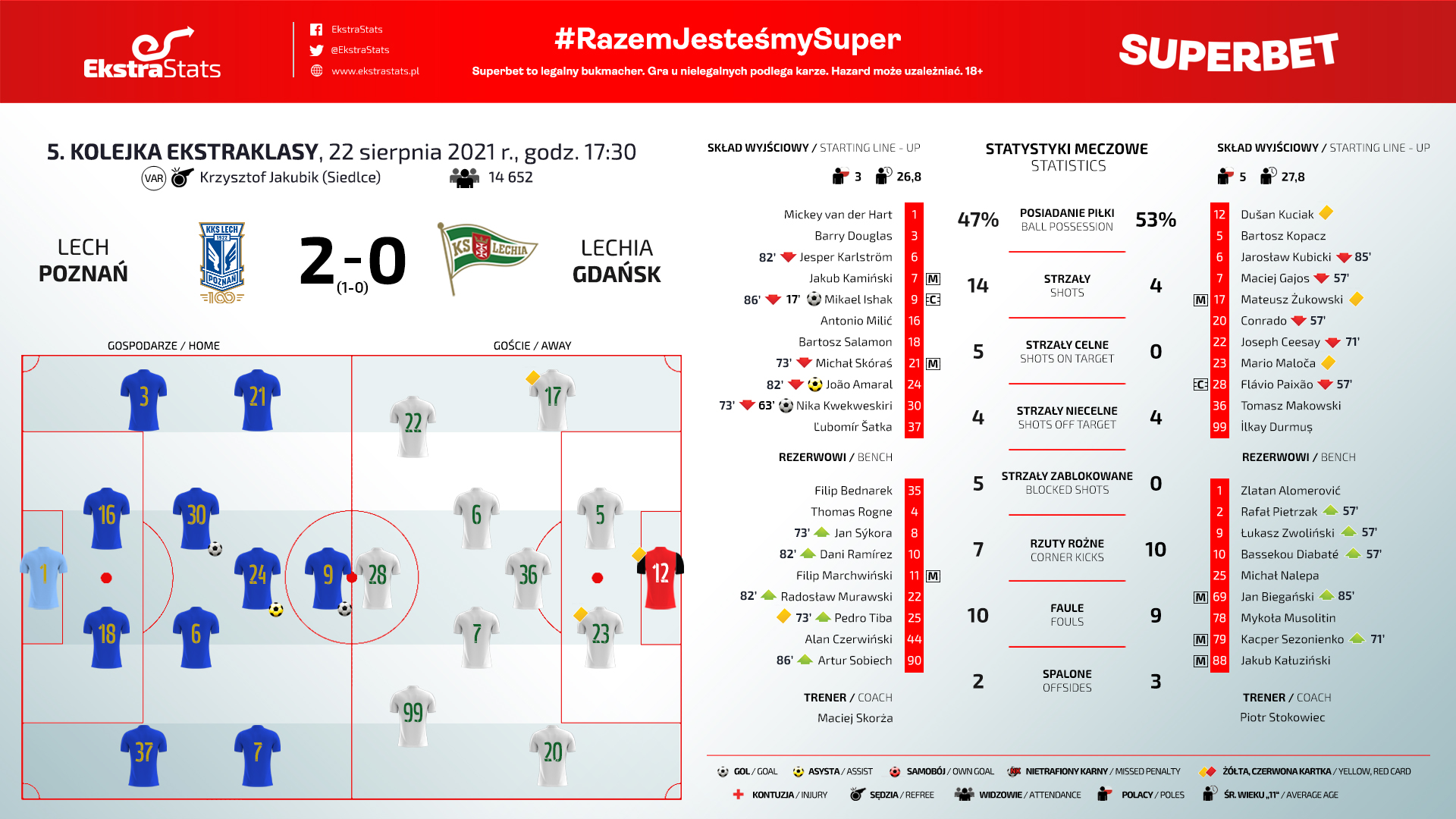 Познаньцы продолжали атаковать, но Куцьяк спасал «Лехию» раз за разом, а периодически хозяев подводила точность. Но и этого хватило для уверенной победы. В 5 турах «Лех» набрал 13 очков - это лучший старт сезона в исполнении познаньцев, начиная с сезона 1992/1993. Познаньский поезд, кажется, набрал хороший ход и останавливаться не собирается. Правда, в ближайших турах подопечных Скожи ждут две серьезные проверки в лице «Погони» и «Ракува».