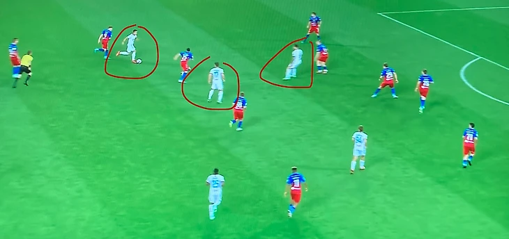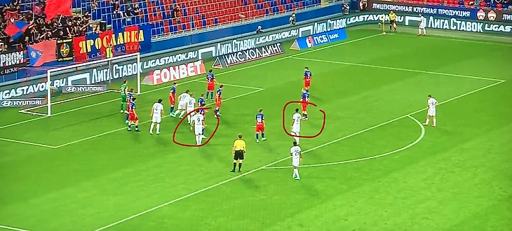Тоже можно сказать и про Смолова, почему его опекает Бистрович, стоя спиной к форварду? В момент подачи углового Смолов двигается в сторону ворот, а хорват просто выключается из игры и становится наблюдателем. Казалось бы, ближнюю штангу закрывает Тикнизян и он должен был закрыть активизировавшегося Смолова, однако и он в этой ситуации включил режим статиста и просто наблюдал, как Федор спокойно закатывает мяч в ворота.