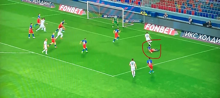 А вот уже другой момент, в котором Тикнизян упускает игрока Локомотива, оказавшись на газоне на пятой точке. Чудом момент не заканчивается голом.
