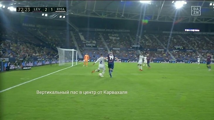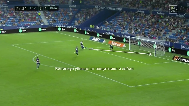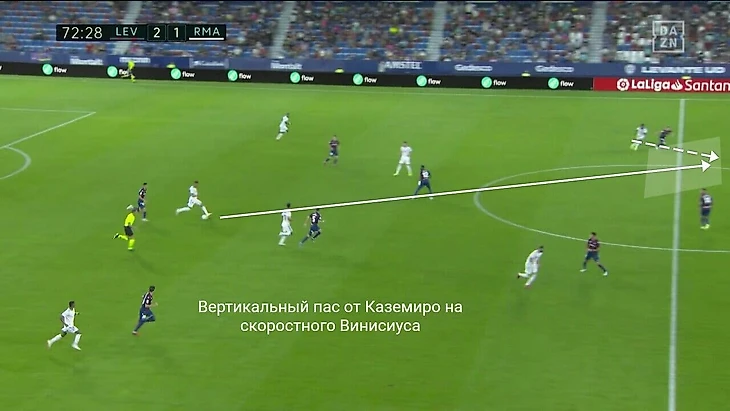 Второй гол Реала - отличный пример перехода из обороны в атаку и вертикального футбола. Сначала игрок Леванте отдал пас на ход во фланг вингеру, но у него выиграл мяч Карвахаль и сразу же отдал вертикальный пас на Каземиро, тот - на ход Винисиусу, который и убежал от защитника за счёт своей скорости и забил мяч в дальний угол. Вся суть в том, пока соперники не успели встать на свои позиции, пока у соперника есть разрывы - максимально быстро использовать это.