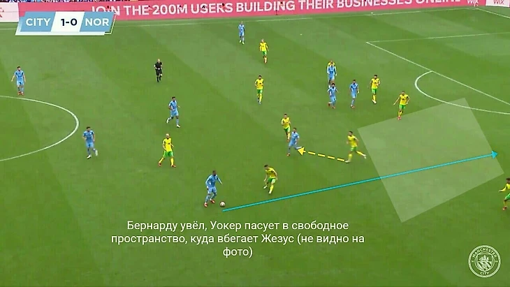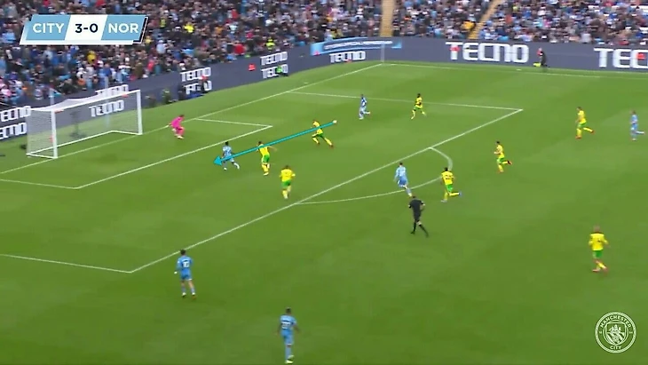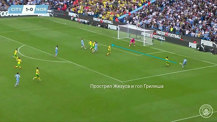 В этой атаке было прекрасно всё: как Бернарду увёл центральнего защитника, как Жезус открылся в это пространство и прострелил, как Уокер выбрал правильное время паса на Жезуса вразрез, да и вообще, это первый гол Грилиша за Ман Сити!