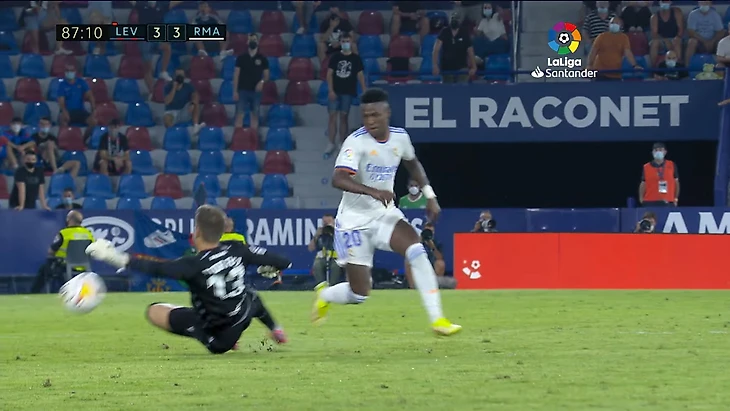 Давно не видели полевого в воротах? Вратарь «Леванте» устранился за игру рукой в центре поля, лишив Винисиуса хет-трика