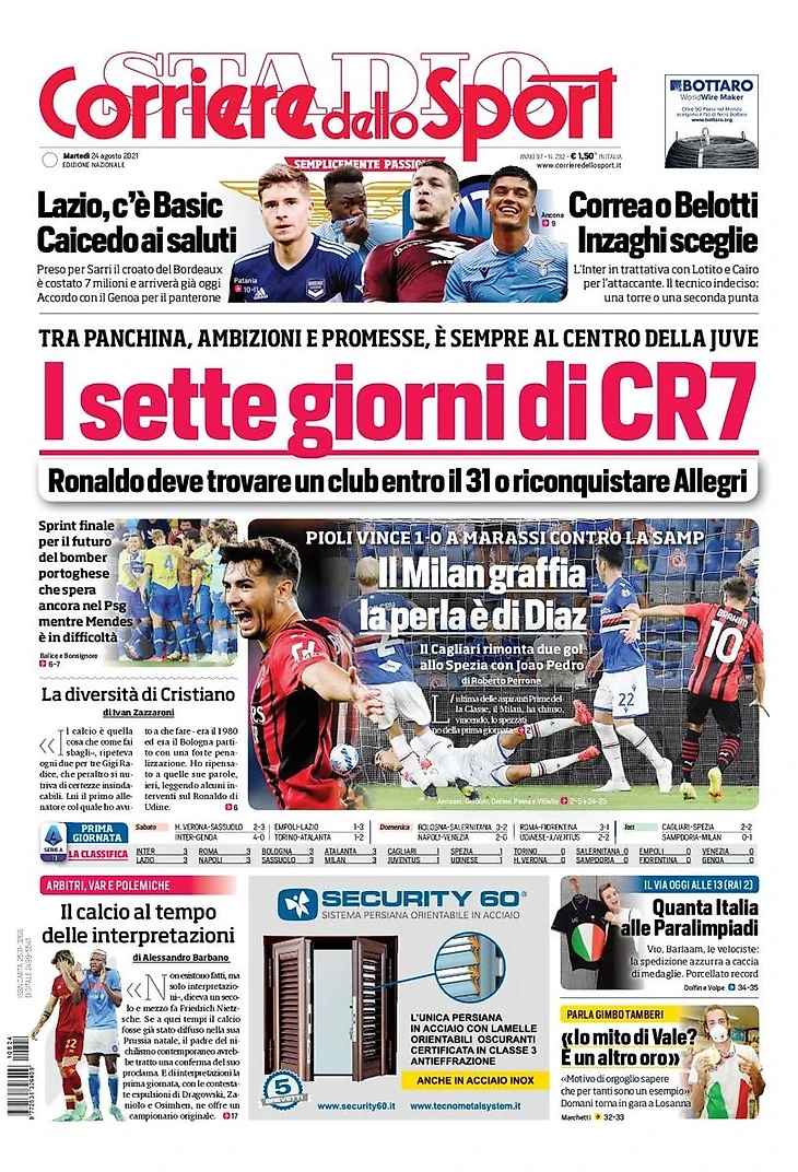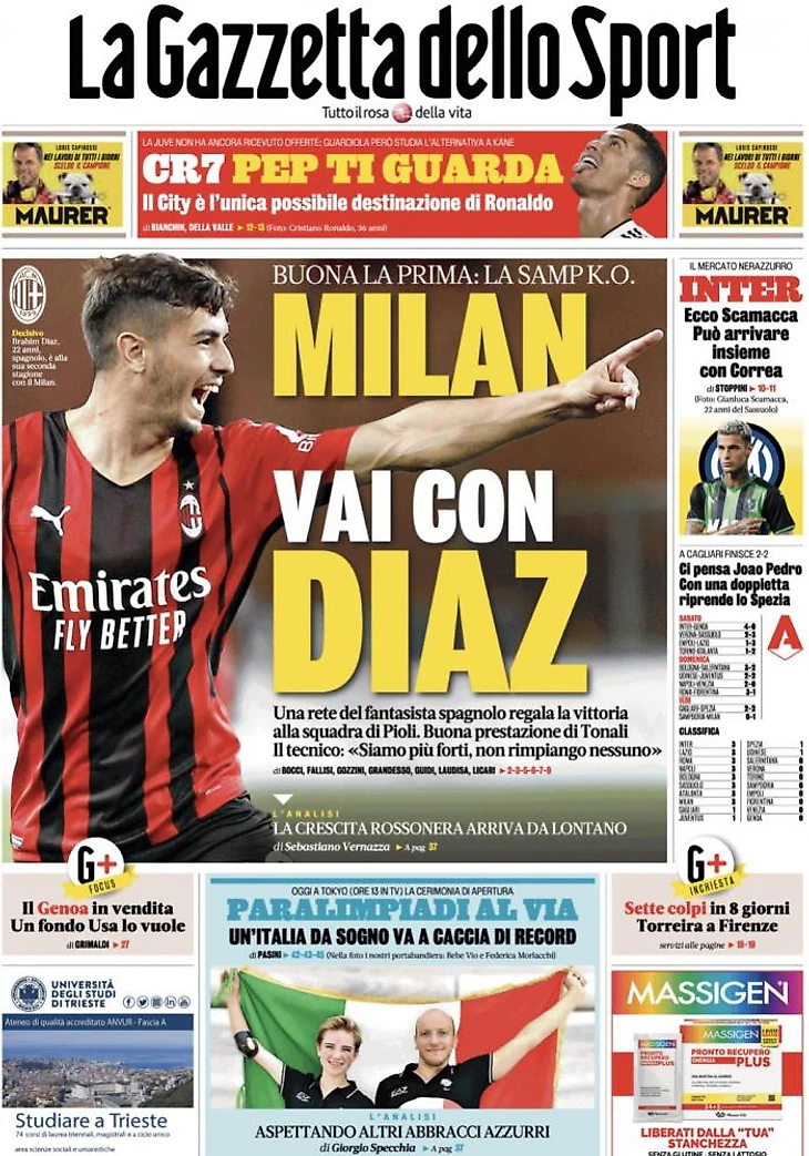 «Милан» идёт с Диасом. Заголовки Gazzetta, TuttoSport и Corriere за 24 августа