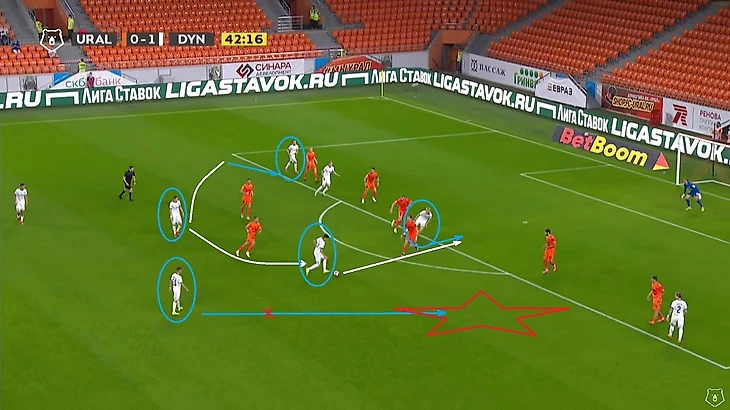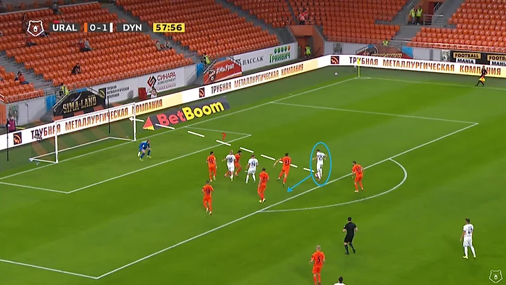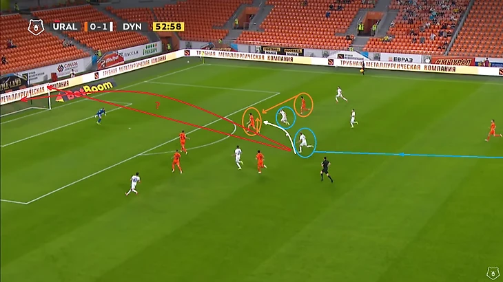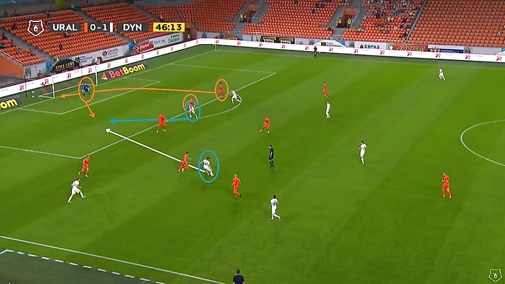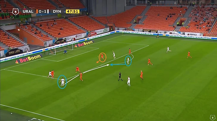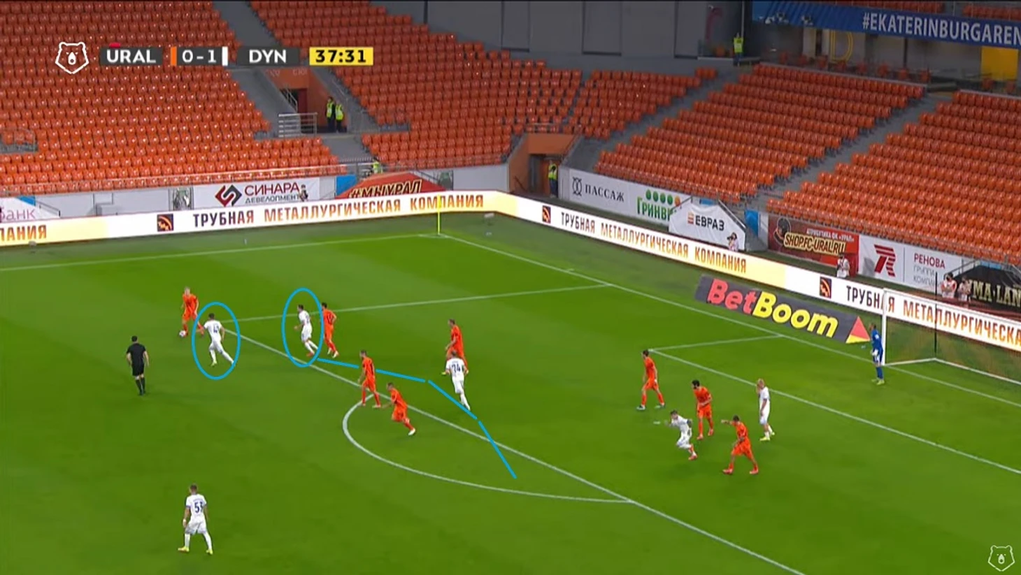 Концовка первого тайма прошла под контролем Динамо, проведшего пару затяжных атак и подавшего несколько угловых. В одной из таких атак я отмечу ещё один хороший пас Захаряна и снова из центра. Также обратите внимание на позицию Шиманьски. Себа не сместился на правый фланг вместо Макарова. Возможно Динамо не хотело атаковать большими силами, подстраховывая себя на случай контратаки Урала. Перерыв.