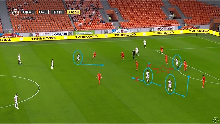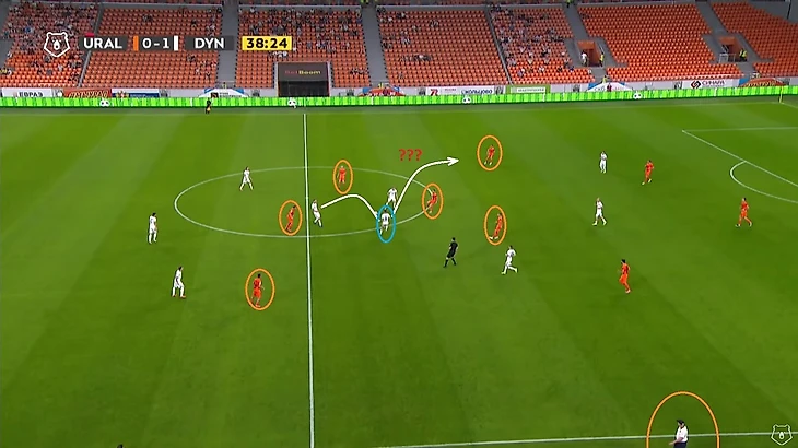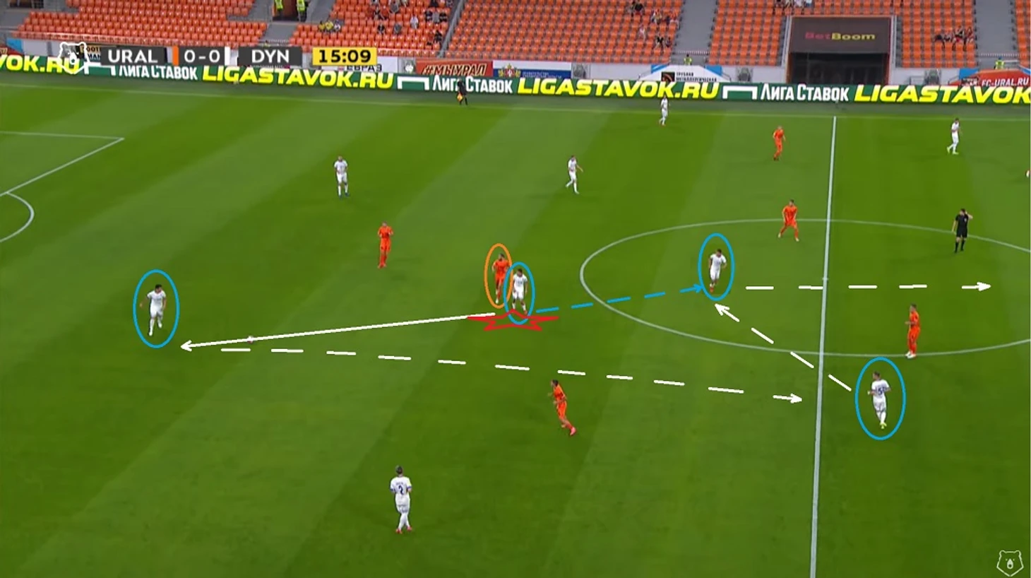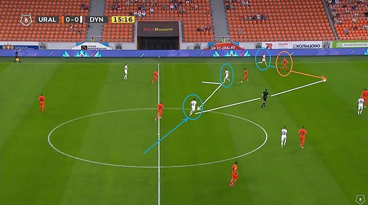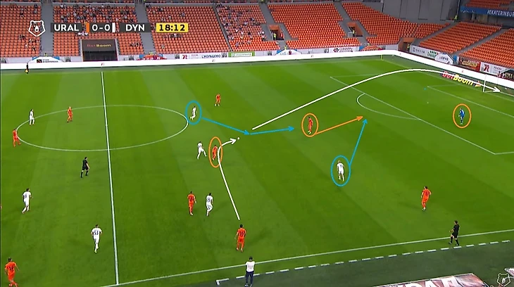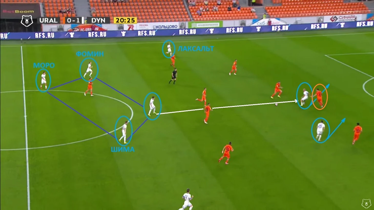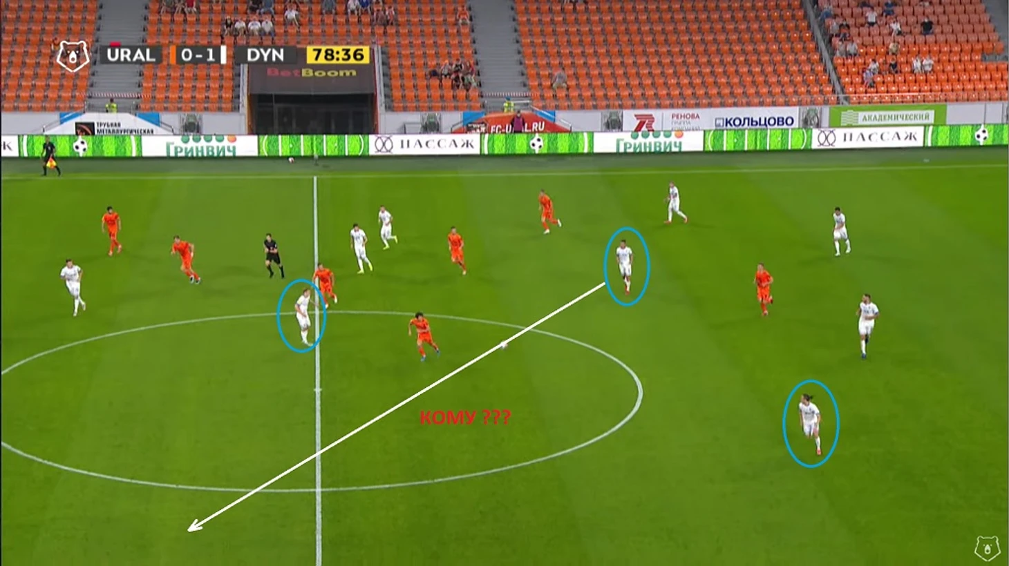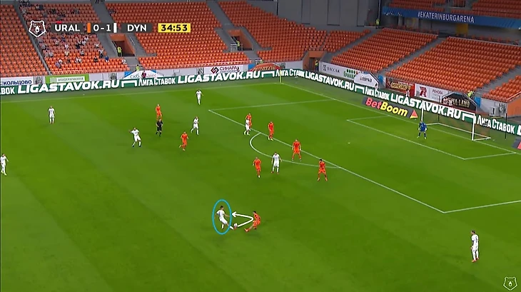 Динамо, в свою очередь, отвечает забросом Захаряна слева на Макарова, оказавшегося также на левом фланге, но вратарь Урала первым успевает к мячу. Вот так и прошли незаметно первые десять минут: Динамо играло чуть быстрее, но в целом игра была равной. Ничем особенным кроме нарушений и обрезов Бальбуэна и Ордеца (как раз на десятой минуте) этот отрезок первого тайма не запомнился. За следующие 5 минут можно отметить жёлтую карточку Лаксальту, а также попытку Макарова обыграть защитника на углу штрафной площади Урала. Тут то и проявилась маленькая проблемка Дениса. Если помните, в свой дебют он в прямом смысле ворвался в игру, но вот без скорости Денис обводит соперника не так успешно, что снижает его эффективность против команд с пятью защитниками — ему просто некуда вбегать. К счастью, сегодняшний соперник не стал ставить автобус как Ахмат, и какое-то время Урал старался играть в футбол. На 15й минуте Диего Лаксальт наносит первый удар в игре, но сильно мимо ворот. А теперь давайте посмотрим, как не нужно открываться центре поля и для этого нам поможет Никола Моро. После передачи назад на Бальбуэна он… остался за спиной Бикфалви. Хотя Никола мог, к примеру, отойти вглубь, чтобы разыграть комбинацию через Шиманьски: