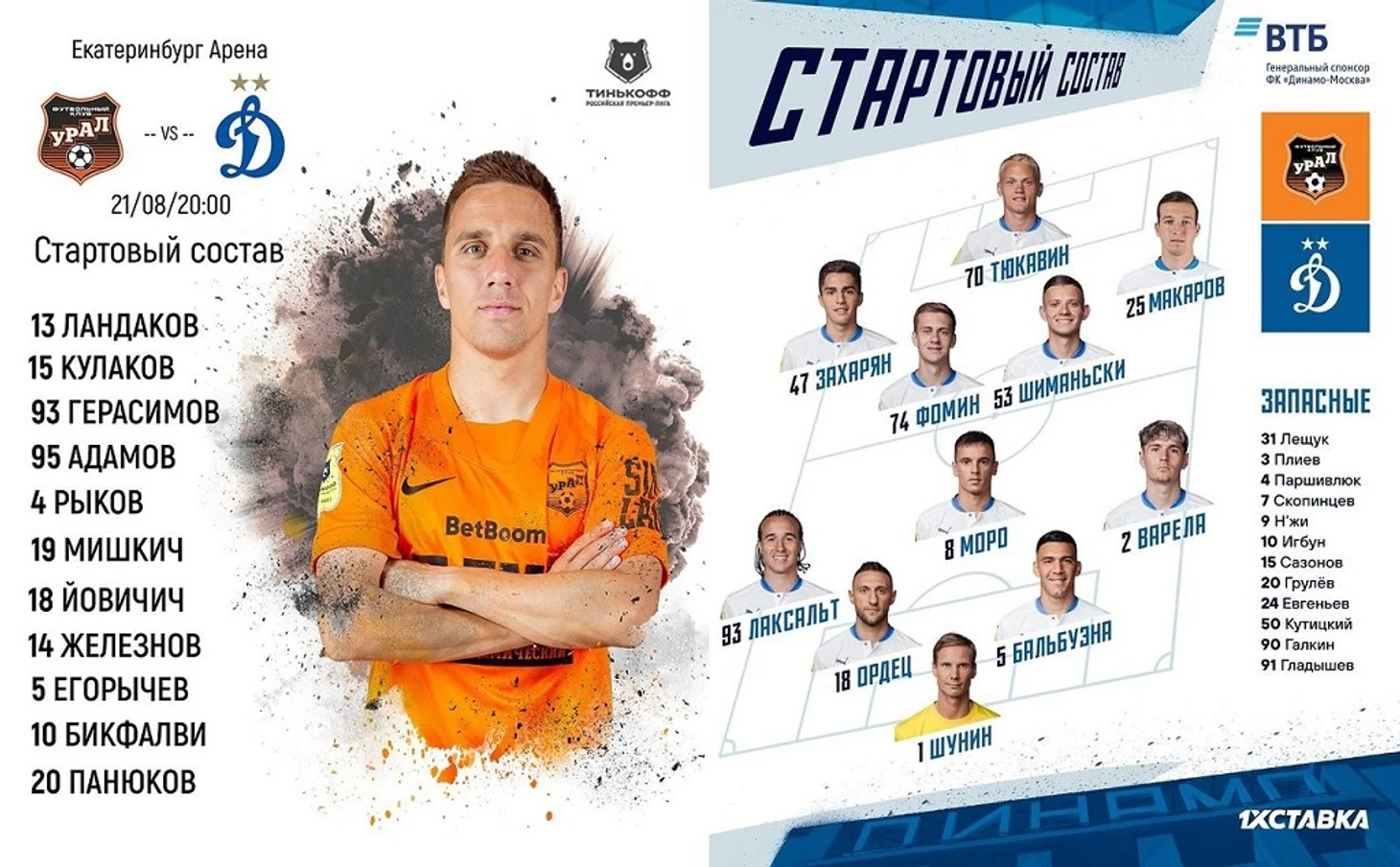Составы. Если после победы в дерби изменения в нашем составе вряд ли могли произойти, то после поражения в Грозном такие перемены в Динамо назрели. Тем более, можно было дать шанс другим игрокам против самой слабой команды лиги после первых четырёх туров. Но у главного тренера Сандро Шварца было своё мнение и в стартовом составе произошла лишь смена правого защитника: Варела вместо Паршивлюка. Если мы были в лидирующей группе, забивали в каждом матче и имели относительно спокойный информационный фон, то у екатеринбуржцев положение было диаметрально противоположным: последнее место, всего один забитый мяч, ограничения на матчах, слухи в СМИ… Помимо замены в стартовом составе Рафала Аугустыняка на Бранко Йовичича в центре и голкипера Ярослава Годзюра на дебютанта РПЛ Дмитрия Ландакова, две недели назад у Урала сменился главный тренер: Игорь Шалимов вместо Юрия Матвеева. Примерно в такой же ситуации были и подмосковные Химки 11 месяцев назад: были внизу турнирной таблицы и поменяли тренера перед игрой с Динамо. Другими словами, в истории Динамо уже были игры с похожим слабым соперником, но результат был печален. И именно на это, в первую очередь, и должен был обратить внимание наш тренерский штаб.